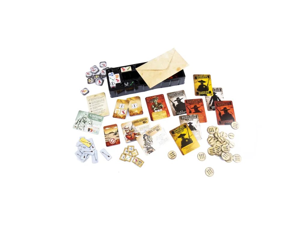 Kompletní sada kostkového Bangu! v jednom originálním balení. Najdete v něm základní hru Bang! Kostková hra, 2 rozšíření - Bang! - Old Saloon a Bang! kostková hra - NEmrtví nebo živí a nakonec 4 zcela nové postavy. Hra Bang! Kostková exploze obsahuje: 9 kostek, 36 karet postav, 18 karet rolí, 1 kartu ducha, 29 malých karet, 17 přehledových karet, 3 rozdelovače karet, 10 žetonů šípů, 44 žetonů nábojů, 7 žetonů ducha, 15 žetonů soubojových zranění, 3 listy pravidel, 3 karty českých a slovenských pravidel.