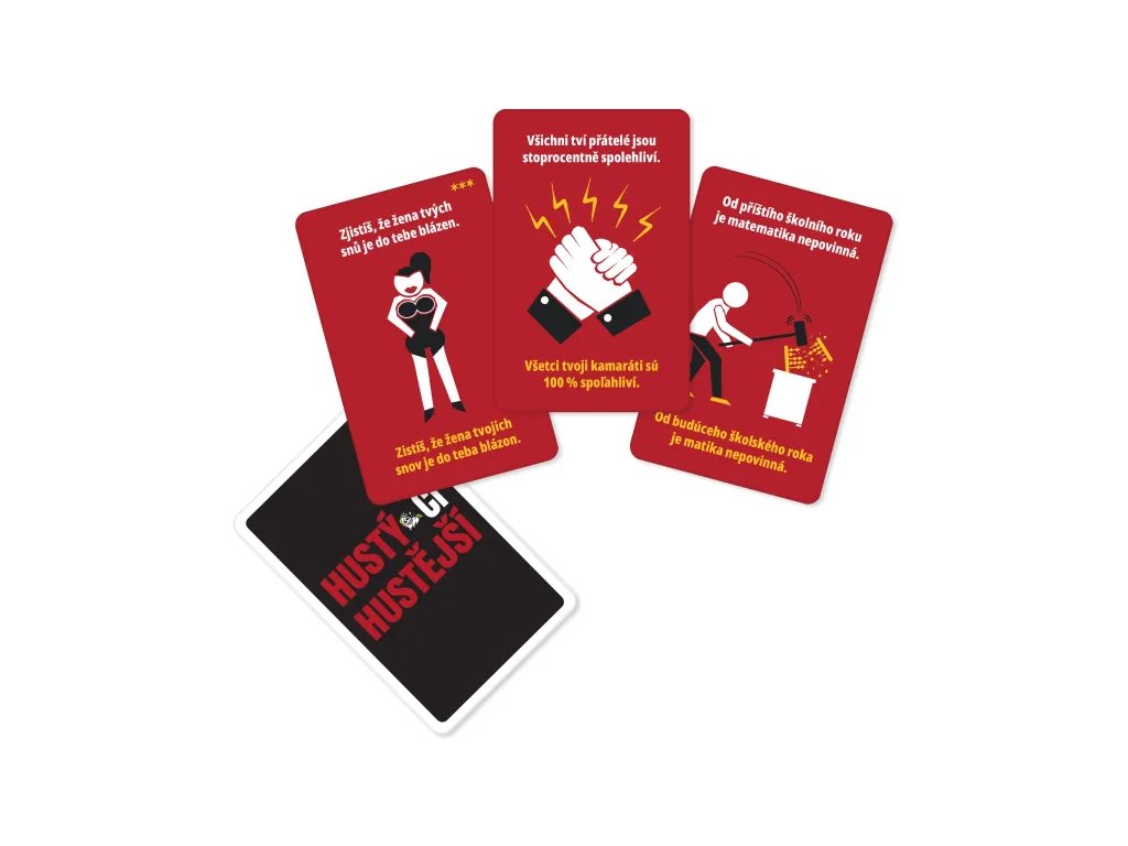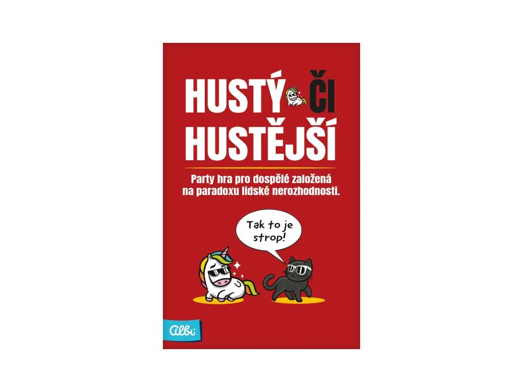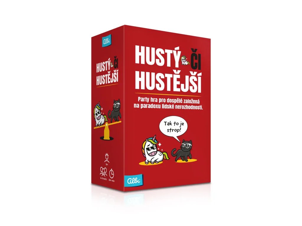 Hustý či hustější je nekorektní párty hra pro dospělé od 18 let. Budete postaveni před 2 ideální situace, vaším úkolem je vybrat si jednu z nich. Lze kombinovat s hrou Blbý či blbější. Hra obsahuje: 240 karet, 16 hlasovacích žetonů, pravidla v českém a slovenském jazyce.