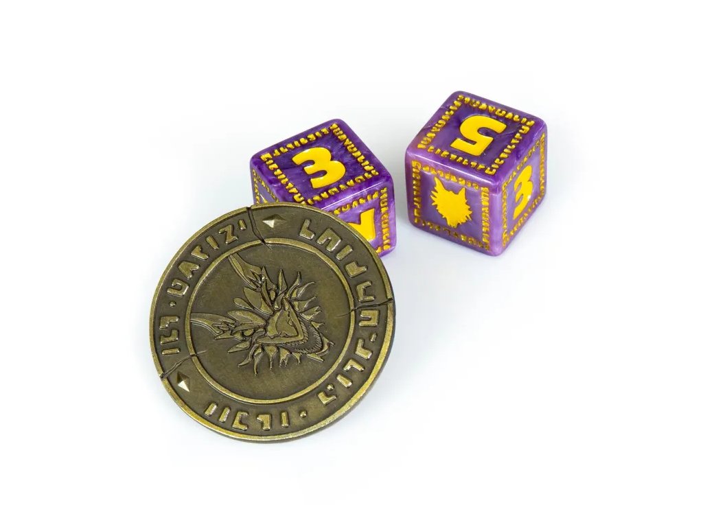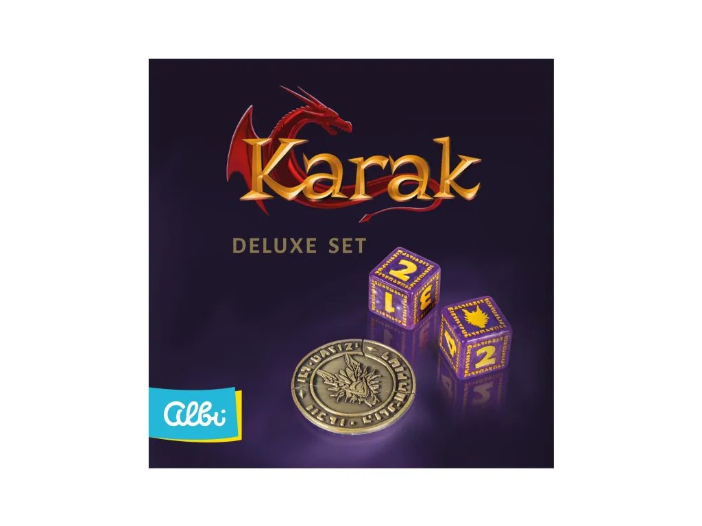 Karak: Deluxe set obsahuje exkluzivní komponenty pro oblíbenou rodinnou hru Karak. Najdete v něm 2 šestistěnné kostky v Karak designu s dračí hlavou místo čísla 6 a kovový žeton prokletí. Rozměr kostek: 1,8 × 1,8 cm