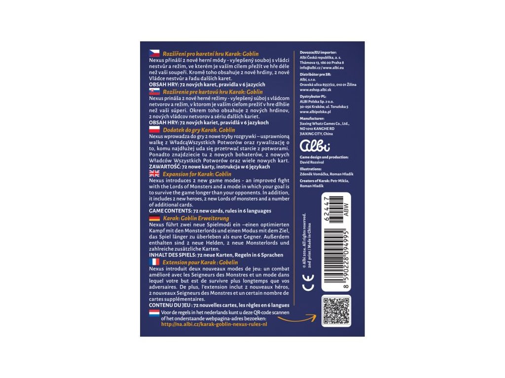 Karak: Goblin - Nexus od Albi je rozšíření pro karetní hru Karak: Goblin. Rozšíření přináší dva nové herní režimy, hra je tak rychlejší a napínavější. Hra obsahuje: 5 karet bossů, 27 akčních karet bossů, 2 karty hrdinů, 4 karty lektvarů, 12 startovních karet hrdinů, 10 karet modifikátorů, pravidla v několika jazycích.
