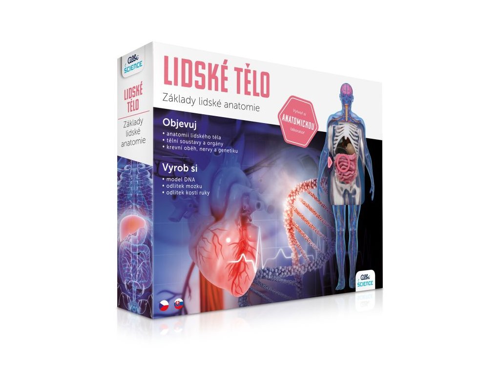Přehledný průvodce anatomií lidského těla pro děti od 8 let. Sada obsahuje průhledný model lidského těla s vyndavacími orgány, kostmi, svaly, nervy a krevními cévami. Sada obsahuje: model lidského těla a stojánek, 9 měkkých orgánů, 4 krevní cévy a 1 nerv, 12 kostí a svalů, pinzetu, peán (kleště), model DNA, formu na odlití lidského mozku a kostí ruky, kádinku, akrylové barvy, štětec, brožuru plnou zajímavostí o anatomii lidského těla.