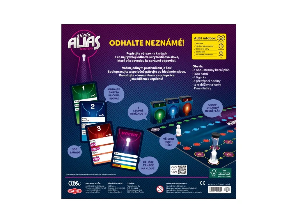 Kooperativní hra na párty, ve které hráči nejprve hádají klíčová slova a poté společně pátrají po hledaném slovu. Pro 2 a více hráčů od 12 let. Hra obsahuje: 1 oboustranný herní plán, 300 karet, 1 figurku, 1 přesýpací hodiny, 3 krabičky na karty a pravidla hry.
