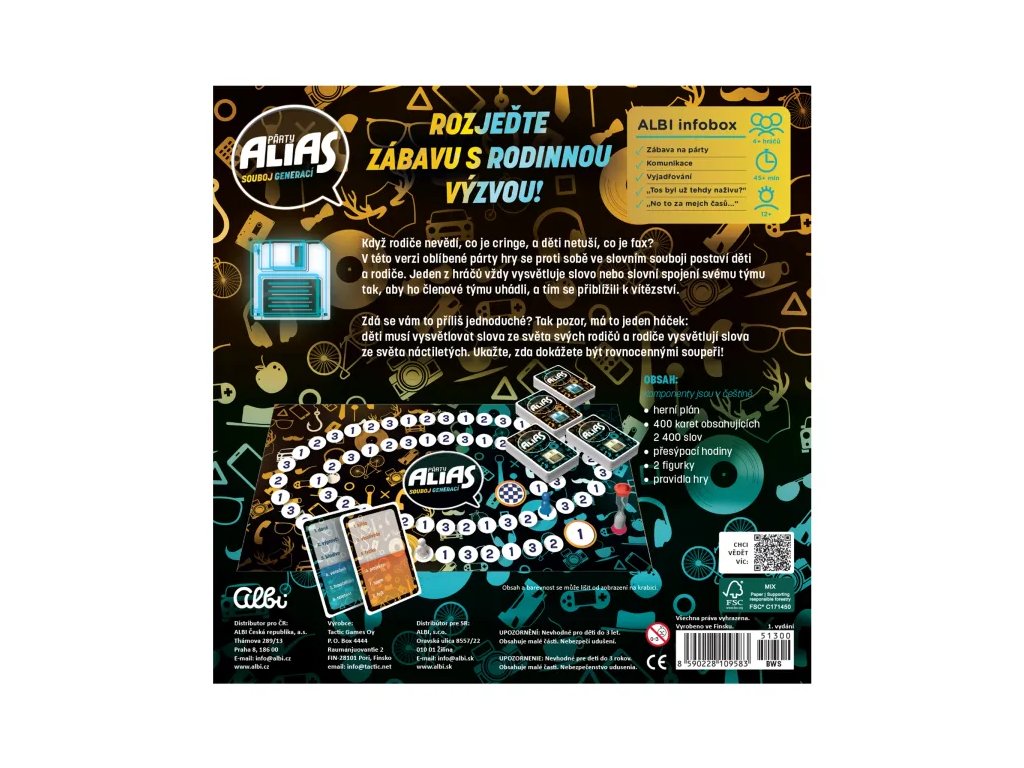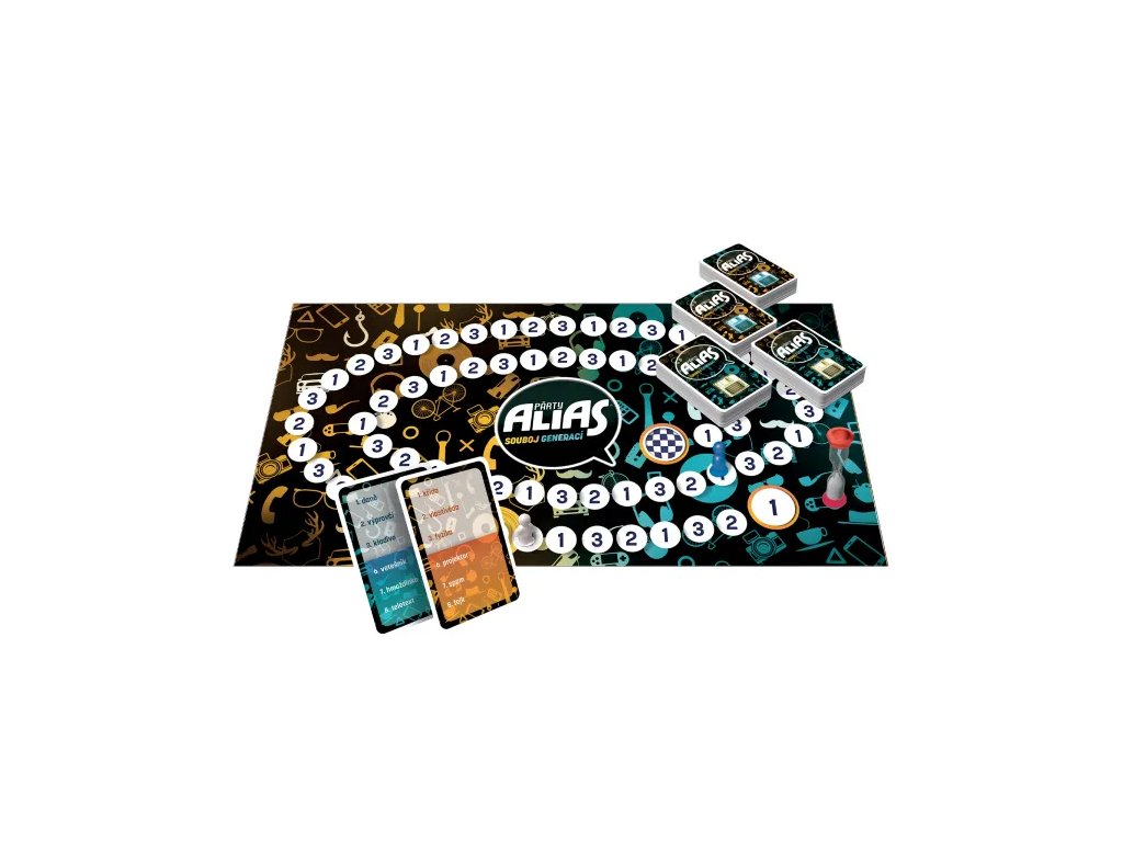 Vyzkoušejte novou verzi oblíbené hry Párty Alias, ve které se proti sobě ve slovním souboji postaví děti a rodiče. V této verzi najdete pouze úkoly s mluvením, žádná pantomima ani kreslení. Hra obsahuje: herní plán, 400 karet obsahujících 2 400 slov, přesýpací hodiny, 2 figurky a pravidla.