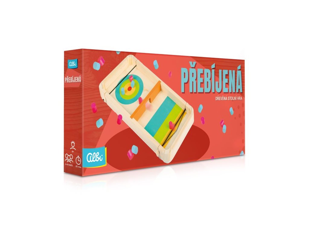 Dřevěné stolní hry od Albi je série 3 jednoduchých zábavných her pro 2 hráče. Přebíjená je svižná hra, ve které se snažíte dostat co nejrychleji všechny žetony na soupeřovu stranu. Hra Přebíjená obsahuje: herní desku, 2 gumičky, středový díl a 10 puků.