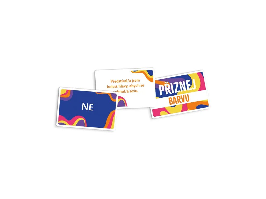 Začínající hráč vyloží kartu s výrokem a ostatní tajně odpoví „ano/ne“. Následně musí tipnout počet „ano“ a přiřadit odpovědi konkrétním lidem. Za správné tipy získává body. Konverzační karty Přiznej barvu jsou ideální pro 3-10 hráčů. Verze Pro kamarády 18+ má otevřenější a odvážnější otázky. Hra obsahuje: 89 karet s výroky, 10 kartiček ANO, 10 kartiček NE, 1 pravidla.