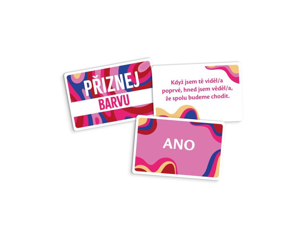 Začínající hráč vyloží kartu s výrokem a ostatní tajně odpoví „ano/ne“. Následně musí tipnout počet „ano“ a přiřadit odpovědi konkrétním lidem. Za správné tipy získává body. Přiznej barvu jsou zábavné konverzační karty. Verze pro Páry je zaměřená na vztahy, intimitu a vzájemné poznávání. Hra obsahuje: 89 karet s výroky, 10 kartiček ANO, 10 kartiček NE, 1 pravidla.