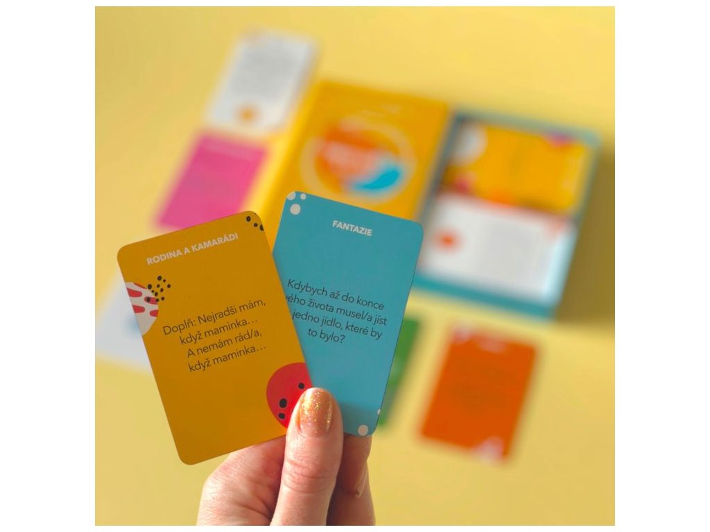 Karty obsahují 100 unikátních otázek rozdělených do 5 tematických kategorií – Na každý den, Fantazie, Moje pocity a emoce, Rodina a kamarádi, Co je lepší? Na závěr na vás čekají originální odměny. Hra obsahuje: celkem 130 karet - 100 karet se 100 otázkami, 7 edukačních karet emocí a pocitů, 21 karet odměn, návod pro posluchače a vypravěče, mantru spokojeného dítěte a pravidla hry.