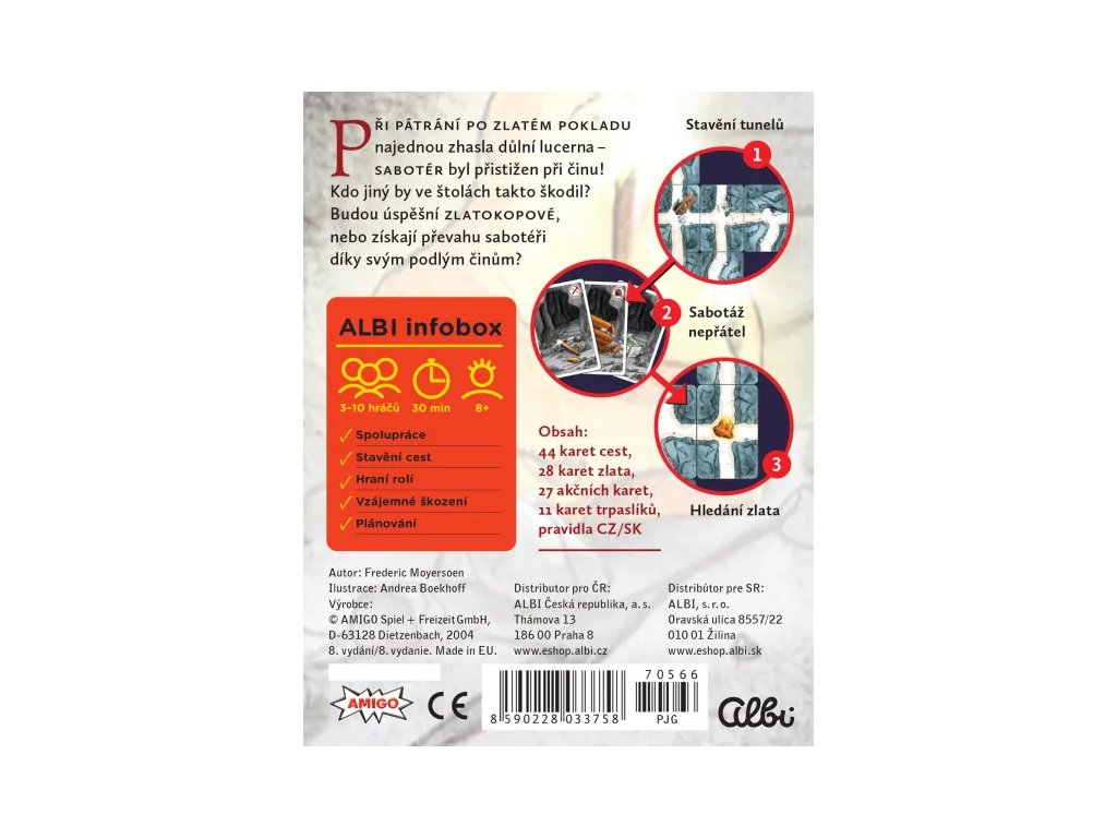 Zábavná karetní hra, ve které mají hráči skrytou identitu. Trpaslíci se snaží prokopat si cestu k pokladu, sabotér či sabotéři kladou trpaslíkům do cesty překážky. Zlato získá ten, kdo bude úspěšnější! Sabotér je až pro 10 hráčů, dá se tedy krásně využít i na párty. Hra obsahuje: 44 karet cest, 28 karet zlata, 27 akčních karet, 11 karet trpaslíků a pravidla.
