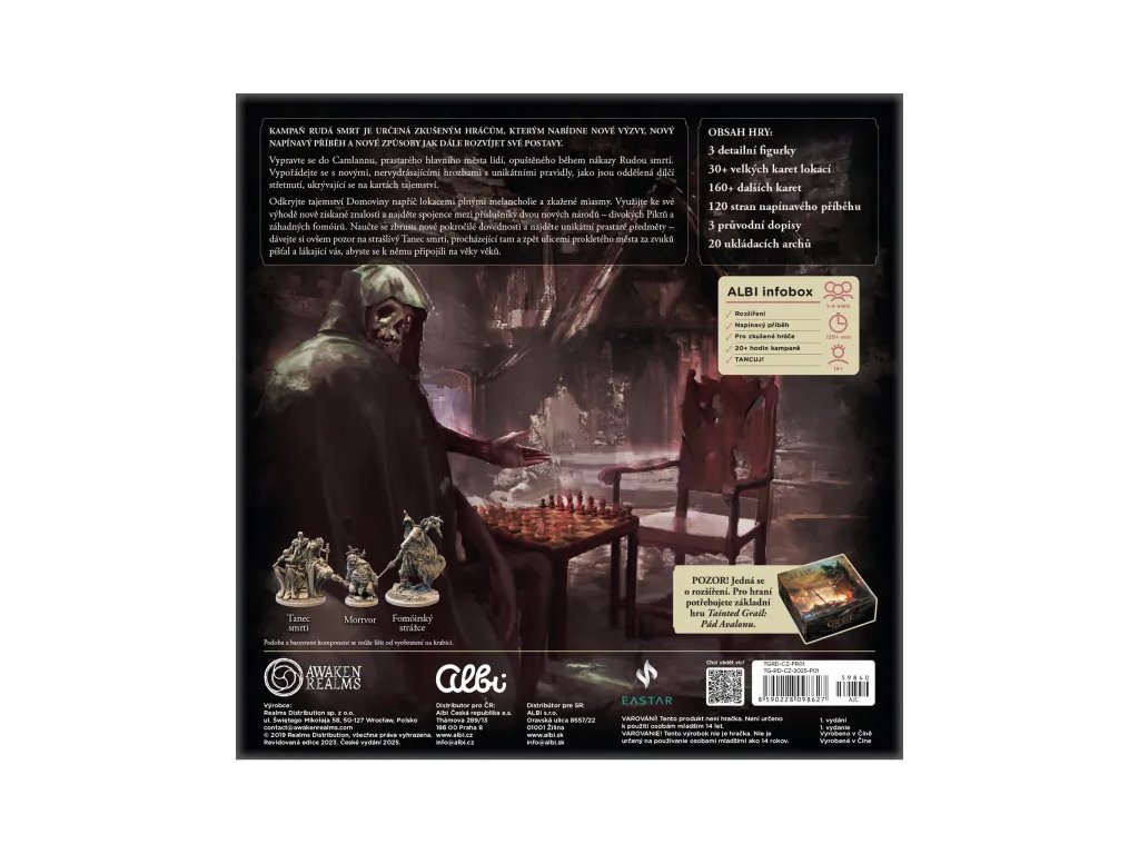 Více než 20hodinová kampaň Rudá smrt je určená zkušeným hráčům, kterým nabídne nové výzvy, nový napínavý příběh a nové způsoby, jak dále rozvíjet své postavy. Pro hru je potřeba vlastnit základní hru Tainted Grail: Pád Avalonu. Hra obsahuje: 3 detailní figurky, 30+ velkých karet lokací, 160+ dalších karet, 120 stránkový Deník výpravy, 3 průvodní dopisy, 20 ukládacích archů.