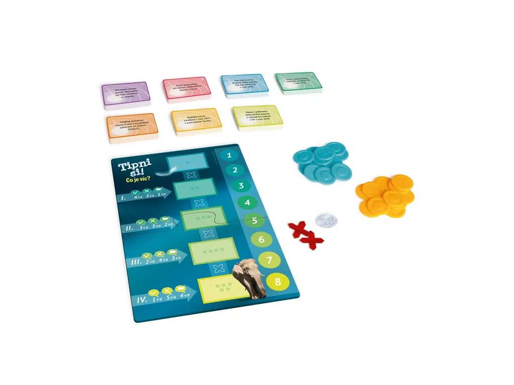 Tipni si! Co je víc? je týmová párty hra, ve které se snažíte porovnat zdánlivě neporovnatelné statistiky, ať už se jedná o počet v kusech, vzdálenost v kilometrech, hmotnost v kilogramech nebo třeba délku trvání v rocích. Hra obsahuje: 420 karet s údaji, žeton kol a 2 žetony námitky, 80 plastových mincí, dvoudílnou seřazovací desku a pravidla.