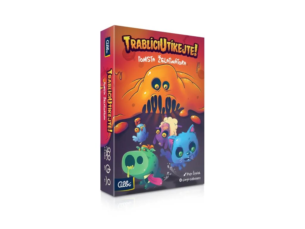 Trablíci utíkejte! Pomsta Želatinátora je svižná dětská hra na 20 minut, ve které budete sbírat sety zombie zvířátek. Hra Trablíci utíkejte!: Pomsta Želatinátora obsahuje: 6 kostek, 60 destiček zvířat, 10 destiček záchranných kruhů, 10 destiček medailí, 4 destičky želatiny, 4 postavičky hráčů, postavička želatinátora, žeton prvního hráče, česká a slovenská pravidla.