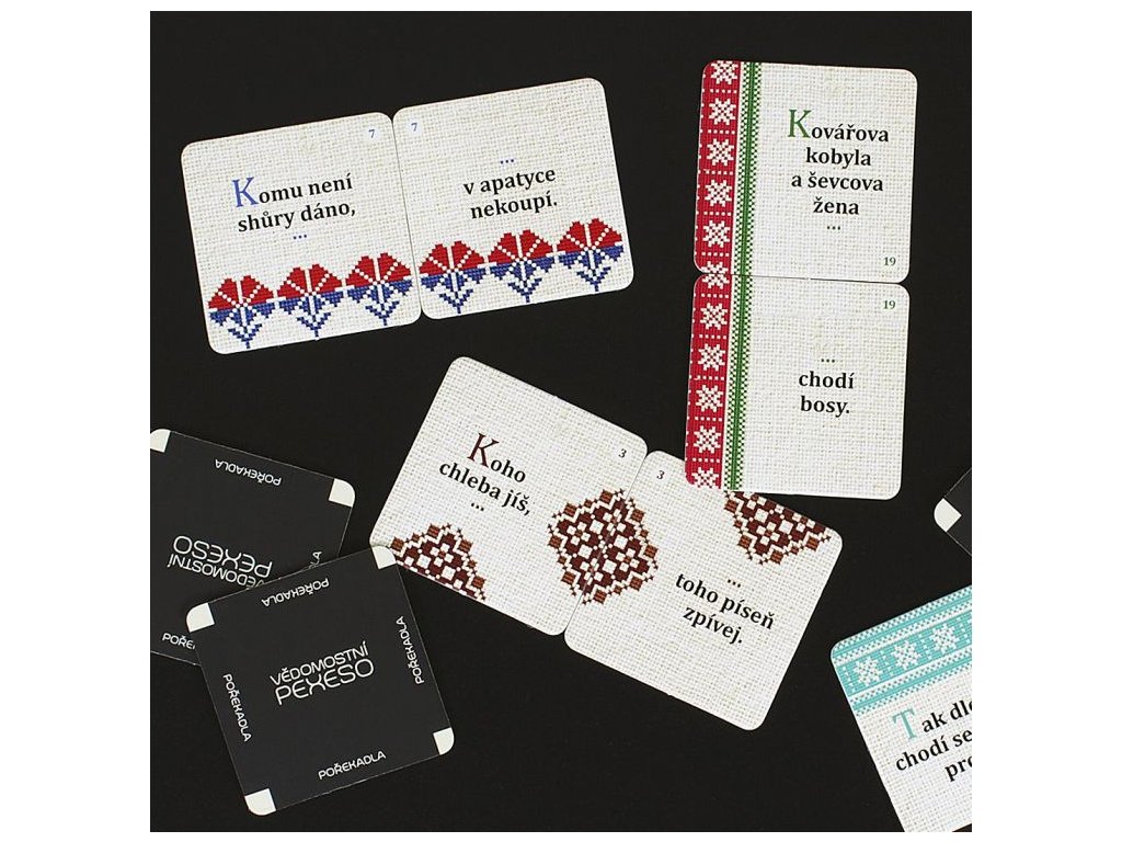 Hra vychází z klasického pexesa. Nehledají se však dva stejné obrázky, ale dvě informace, které k sobě patří. Díky vědomostnímu pexesu si můžete oživit znalosti pořekadel. Hra obsahuje: 48 kartiček (tj. 24 párů).
