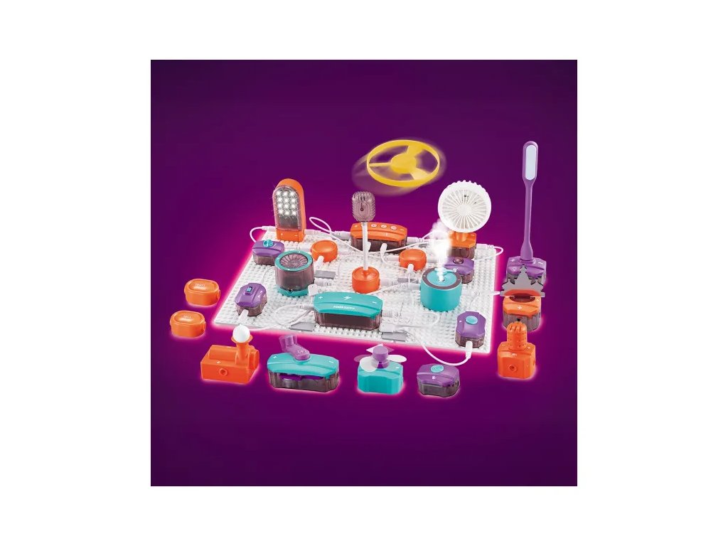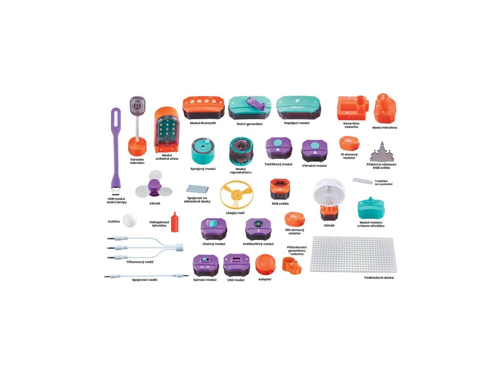 Kreativní vědecká sada pro děti od 8 let, se kterou si dítě bezpečně zapojí více jak 150 obvodů a poznává význam a způsoby zapojení elektrických obvodů. Levitující kulička, vodní sprej, manuální generátor proudu a mnoho dalších. Sada se skládá z 53 kompatibilních komponentů a v návodu najdete více jak 150 způsobů zapojení a vysvětlení principu zapojení. Sada obsahuje: USB lampu, mikrofon, modul Bluetooth, ruční generátor proudu, proudový modul, generátor vzduchu, nahrávací mikrofon, RGB stojánek, sprejový modul, modul klaksonu, klíčový modul, vibrační modul, RGB světlo, modul motoru, modul větráčku, 100 ohmový rezistor, 10 ohmový rezistor, příslušenství k modulu větráčku (2×), adaptér (2×), létající talíř, USB modul, světlocitlivý modul, rotační modul, přepínací modul, hlavu větráčku, jednoduchý vodič (10×), tříkoncový vodič (2×), kuličku (2×), podkladovou desku (3×), trubičku na vysávání, odkapávací lahvičku, spojovač na základové desky (6×) a návod.