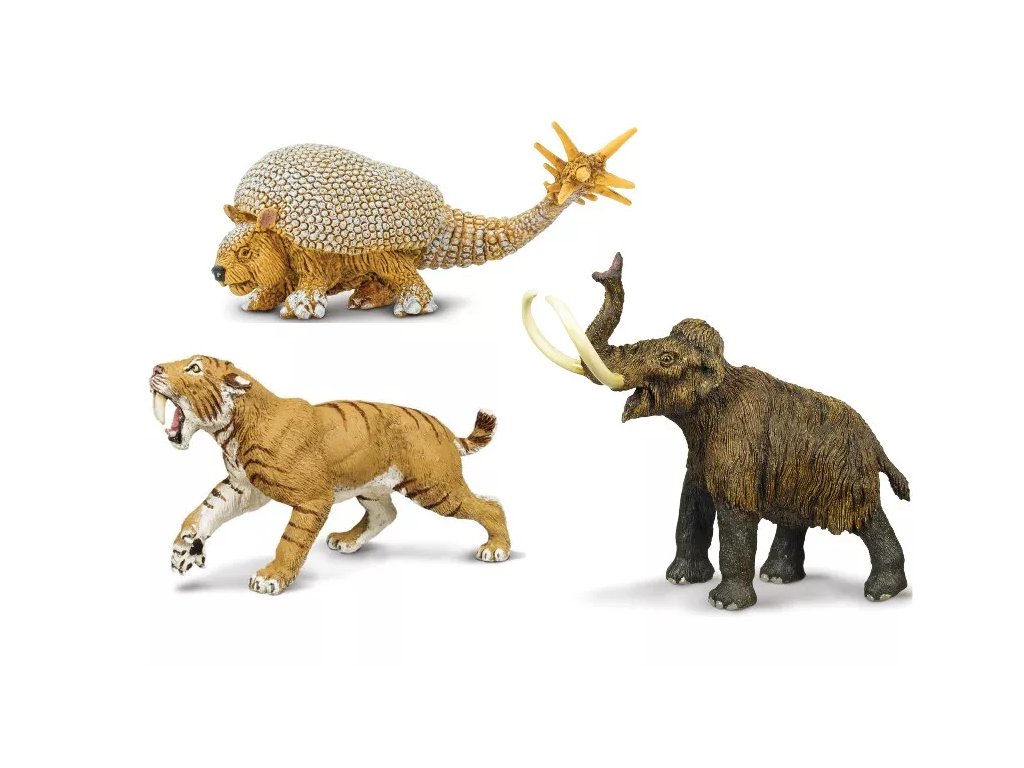 Balíček Cesta do pravěku od firmy Safari Ltd., v kterém najdete tygra, mamuta a doedicuruse. Šavlozubý tygr (SFS279729): 11,2 cm x 4,5 cm x 6,6 cm. Figurka vyhynulé kočkovité šelmy, tzv. "šavlozubých tygrů", připravena na kořist se svými drápy a otevřenou čelistí. Mamut srstnatý (SFS279929): 13 cm x 6,8 cm x 12,6 cm. Figurka ledového obra s velkými zakřivenými kly. Doedicurus (SFS283129): 10,5 x 5,75 cm. Doedicurus je vyhynulý rod pocházející z Jižní Ameriky. Svým vzhledem připomínal pásovce, byl jedním z největších prehistorických býložravců. Safari Ltd. Safari Ltd. je americká firma zaměřená na výrobu ekologických hraček. Na jejím počátku v roce 1982 byla dětská karetní hra na téma ohrožené druhy zvířat. V roce 1986 firma podepsala licenční smlouvu s Carnegie Museum of Natural History. Tato licence umožnila vyrábět autentické modely dinosaurů ve spolupráci s jejich nejlepšími paleontology. S postupným rozrůstáním firmy se začala rozšiřovat i série modelů, které se už neomezovaly jen na dinosaury, ale nabízely pohled na celý svět. Hlavní myšlenkou firmy Safari Ltd. je „učit se hrou“. Navrhuje figurky zvířat tak, aby byly naprosto autentické a svou kvalitou co možná nejvíce odpovídaly skutečnosti. Díky svému ručnímu zpracování je každý výrobek jedinečný. Vzhledem k stále novým vědeckým objevům jsou figurky neustále aktualizovány, mají tak pozitivní vliv na vzdělávání dítěte v oblasti přírody a její ochrany. I proto jsou velmi oblíbenou vzdělávací pomůckou pedagogů celého světa. Touto koncepcí si firma Safari Ltd. vysloužila řadu ocenění za podporu vzdělanosti a význam ochrany životního prostředí a ohrožených druhů. V současné době firma Safari Ltd. nabízí nejen samostatné modely, ale i figurky, které jsou tématicky zařazeny do sad, a to podle oblastí, kde se vyskytují, nebo podle svého živočišného druhu. Můžete se tak detailně seznámit se zvířaty Arktidy, pouště, oceánu a jiných oblastí, nebo zkoumat druhy žab, motýlů, velryb a spousty dalších. Safari Ltd. však neopomíjí ani svět lidí a jeho historii a dílo, a tak můžete poznat nejvýznamnější stavby světa, občanskou válku v Americe, idiány, pravou africkou vesnici, ale dokonce i dopravní prostředky a vesmír. Pro opravdové sběratele jsou k dispozici rozšířené sady! Samostatnou kapitolou výrobků firmy Safari Ltd. jsou produkty z kolekce Safariology. Jedná se o soubor pomůcek do přírody a modely pro pozorování života živočichů a rostlin. Tato kolekce zahrnuje dalokohledy, kompasy, krabičky na brouky, lupy a spoustu dalších nástrojů pro bádání, ale i životní cykly několika druhů zvířat a rostlin, jako je např. mořská želva, kuře, komár, včela, či fazole, ba dokonce i vývoj člověka od svého prapočátku až dodnes. Po tři generace firma Safari Ltd. pokračuje kupředu s jasnou vizí. Rok co rok vytváří stále nové hračky, které vzdělávají a ukazují našim dětem kouzla života na této planetě.