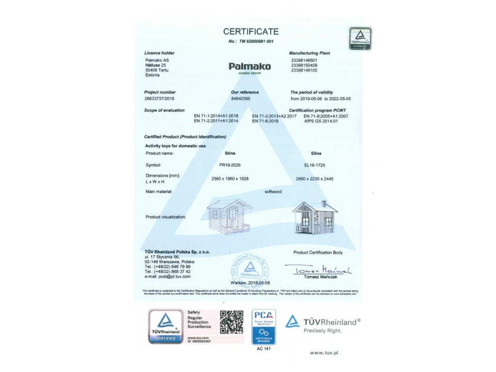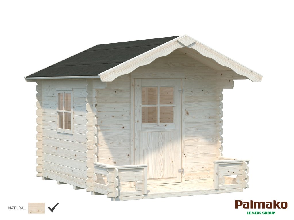 Srubový dětský domeček STINA je větší variantou domečku SAM. Domek je charakteristický svou srubovou vazbou v rozích domku, má čtvercový půdorys, pyšní se klasickou sedlovou střechou s přesahem nad půvabnou verandu, kterou zdobí masivní nízké zábradlí. Průčelí domu vévodí velké dřevěné dveře s velkým okénkem.