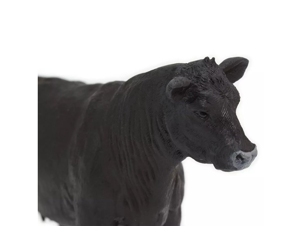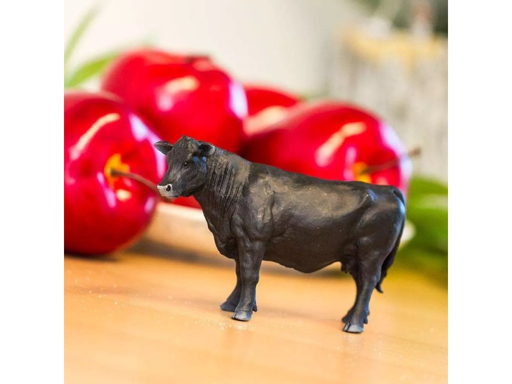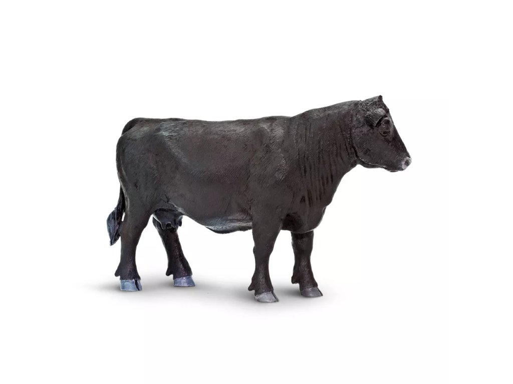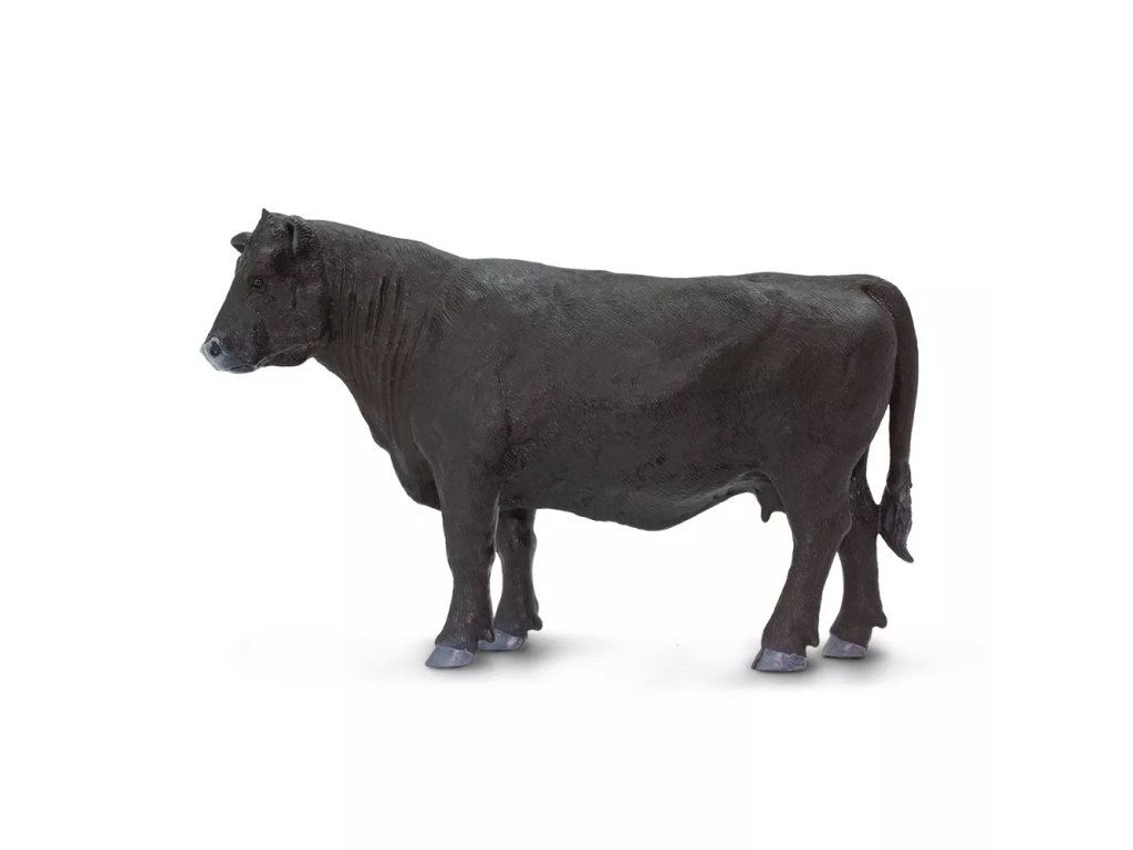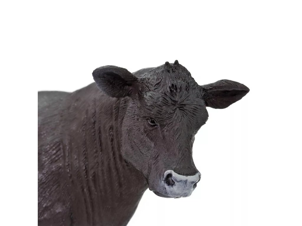 Figurka anguské krávy, plemene skotu, typického bezrohostí a plášťovým zbarvením, zvířata jsou jednolitě černá nebo červenohnědá. Zemí původu plemene je severovýchodní Skotsko.