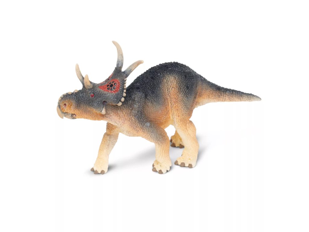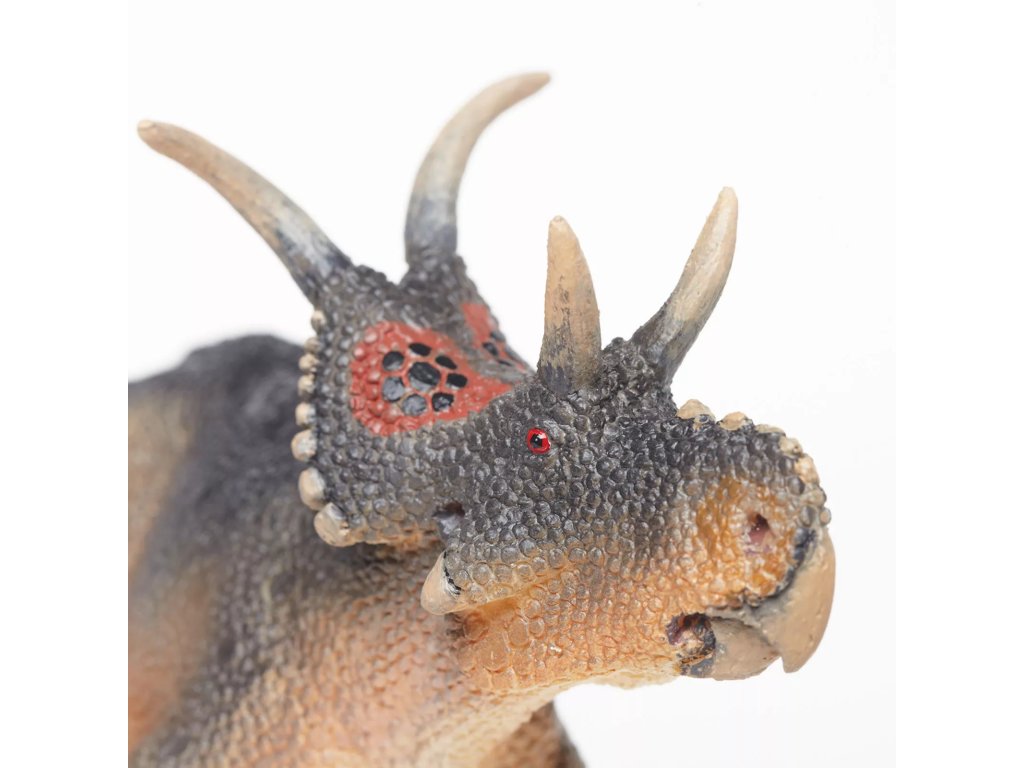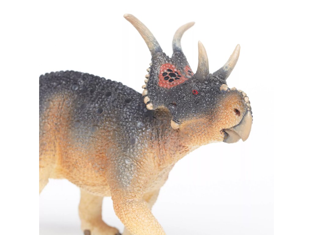 Figurka Diabloceratopse, mohutného čtyřnohého býložravce s relativně velkou hlavou a dlouhým krčním límcem, zdobeným výraznými rohy.