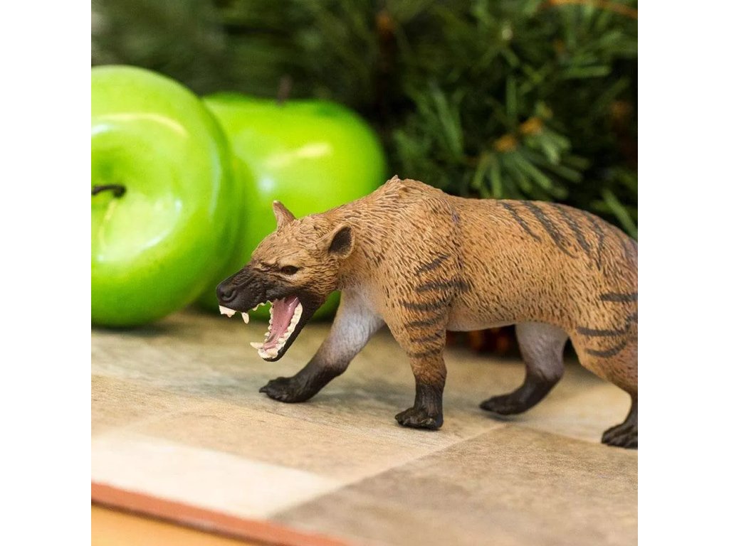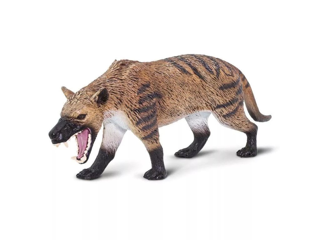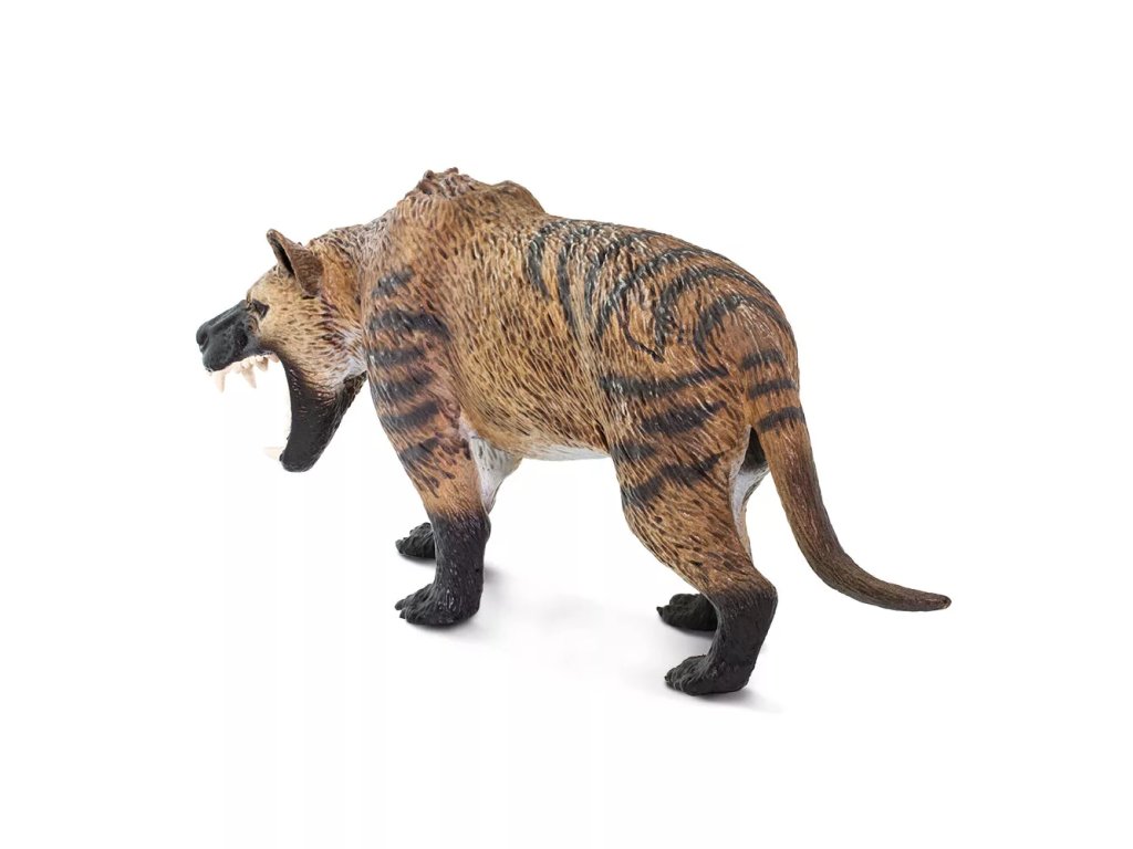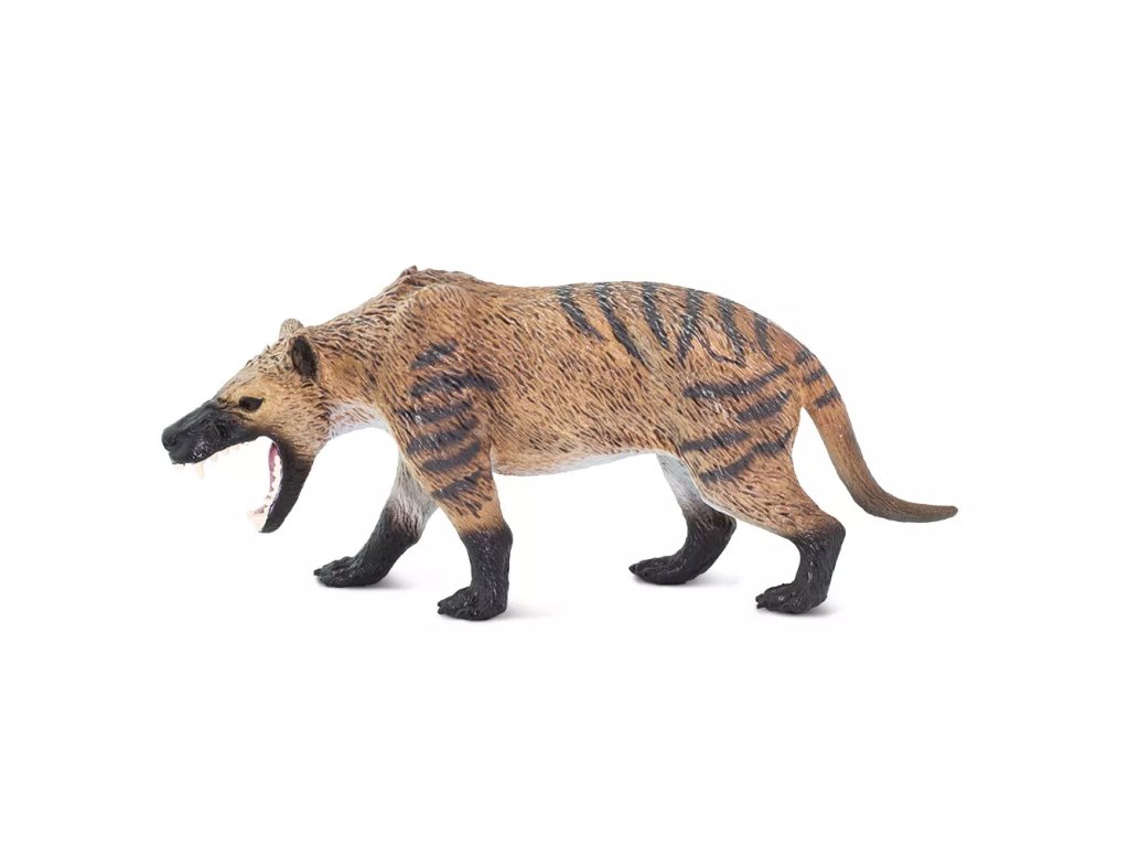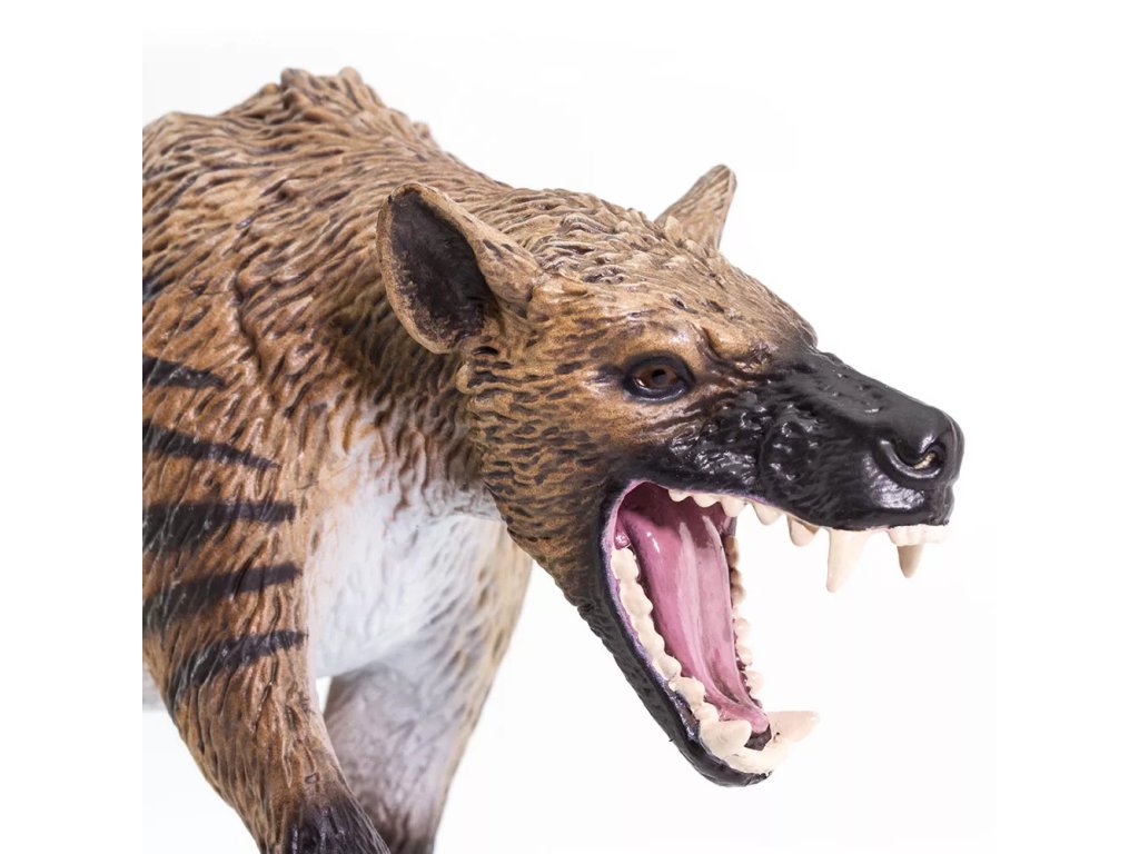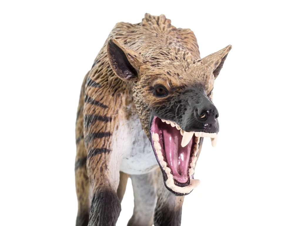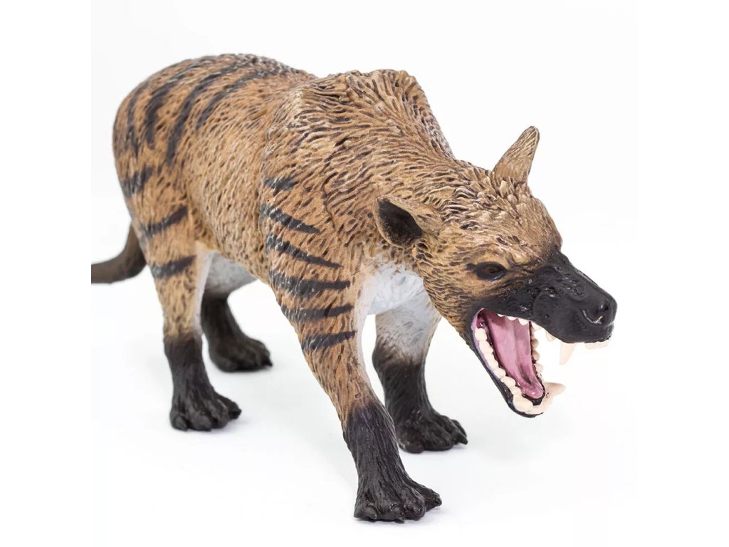 Figurka Hyaenodona giga. Pozůstatky nejstaršího známého Hyaenodona giga byly nalezeny v Asii. Tento druh se dále rozšířil do Evrop a Severní Ameriky. Hyaenodon byl masožravý savec, jež útočil na svou kořist kousnutím do hlavy, nebo krku, podobně jako dnešní psovité šelmy. Velký dravec dosahoval délky až 3 metry, výšky až 110 cm a vážil kolem 500 kg.