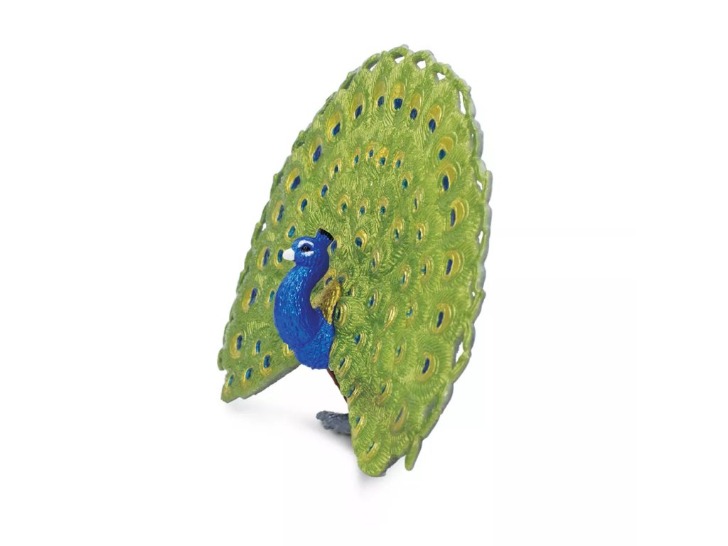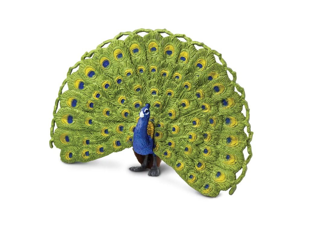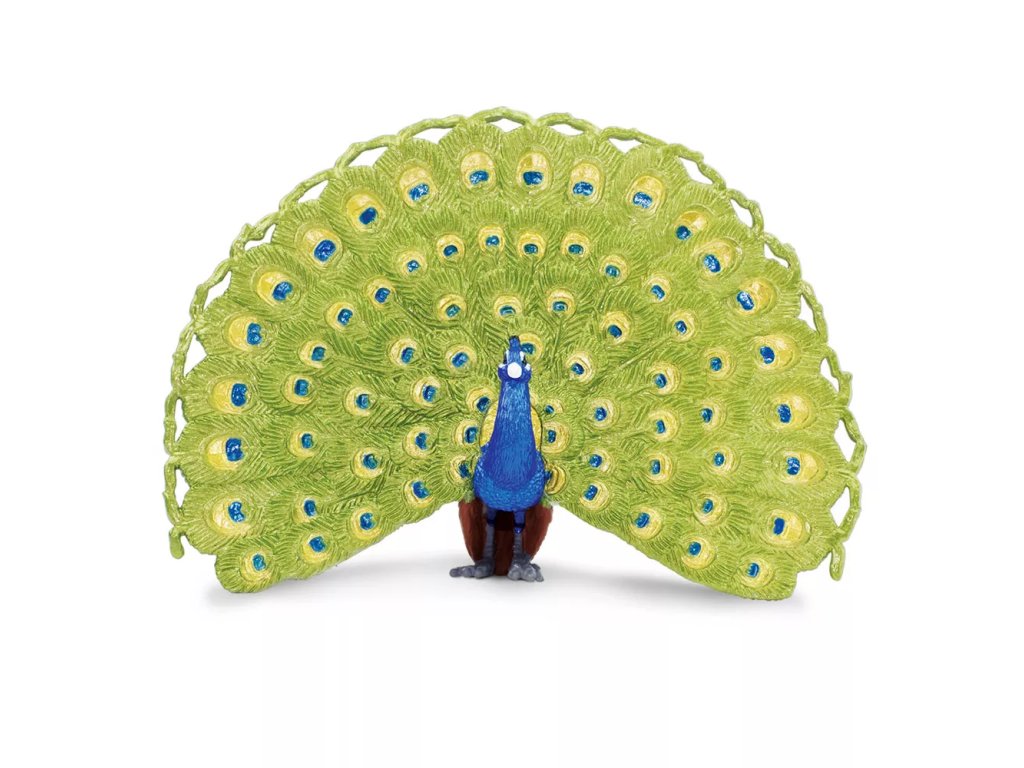 Figurka páva, národního ptáka Indie, který je známý pro své obrovské, pestrobarevné ocasní krovky. Samci mohou i s touto "vlečkou" měřit až přes 2 metry. Působivé zobrazení nad ocasním peřím samce slouží především k přilákání samice. Její zbarvení není tak pestrobarevné, převážně je hnědošedé.