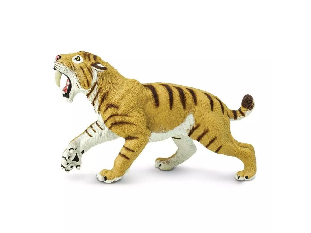 Figurka šavlozubého tygra, vyhynulé kočkovité šelmy, známé pro své mohutné tesáky. Šavlozubý tygr lovil kořist v Severní a Jižní Americe, než asi před 12 000 lety vyhynul.