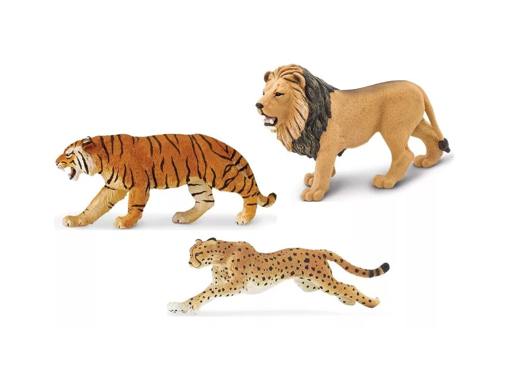 Balíček Kočkovité šelmy od firmy Safari Ltd., v kterém najdete tygra, lva a geparda. Tygr bengálský (SFS270829): 15 cm x 4 cm x 5,7 cm. Tygr je samotářské zvíře. Má své zavedené území, kde žije. Pruhování je méně husté než u ostatních tygrů, černé na žluto až oranžovohnědém podkladě. Lev (SFS290229): 13,5 cm x 3,8 cm x 7,8 cm. Lev je po tygrovi druhá největší kočkovitá šelma. Chrání lvice a mláďata ze své smečky před predátory a jinými lvy. Gepard (SFS290429): 14 cm x 3 cm x 4 cm. Gepard je kočkovitá šelma, proslulá jako nejrychlejší suchozemské zvíře. Může běžet rychlostí přes 110 km/h. Krátkodobě dokonce až 130 km/h. Často cestuje za svou kořistí, aby pak využil příležitosti se nasytit. Safari Ltd. Safari Ltd. je americká firma zaměřená na výrobu ekologických hraček. Na jejím počátku v roce 1982 byla dětská karetní hra na téma ohrožené druhy zvířat. V roce 1986 firma podepsala licenční smlouvu s Carnegie Museum of Natural History. Tato licence umožnila vyrábět autentické modely dinosaurů ve spolupráci s jejich nejlepšími paleontology. S postupným rozrůstáním firmy se začala rozšiřovat i série modelů, které se už neomezovaly jen na dinosaury, ale nabízely pohled na celý svět. Hlavní myšlenkou firmy Safari Ltd. je „učit se hrou“. Navrhuje figurky zvířat tak, aby byly naprosto autentické a svou kvalitou co možná nejvíce odpovídaly skutečnosti. Díky svému ručnímu zpracování je každý výrobek jedinečný. Vzhledem k stále novým vědeckým objevům jsou figurky neustále aktualizovány, mají tak pozitivní vliv na vzdělávání dítěte v oblasti přírody a její ochrany. I proto jsou velmi oblíbenou vzdělávací pomůckou pedagogů celého světa. Touto koncepcí si firma Safari Ltd. vysloužila řadu ocenění za podporu vzdělanosti a význam ochrany životního prostředí a ohrožených druhů. V současné době firma Safari Ltd. nabízí nejen samostatné modely, ale i figurky, které jsou tématicky zařazeny do sad, a to podle oblastí, kde se vyskytují, nebo podle svého živočišného druhu. Můžete se tak detailně seznámit se zvířaty Arktidy, pouště, oceánu a jiných oblastí, nebo zkoumat druhy žab, motýlů, velryb a spousty dalších. Safari Ltd. však neopomíjí ani svět lidí a jeho historii a dílo, a tak můžete poznat nejvýznamnější stavby světa, občanskou válku v Americe, idiány, pravou africkou vesnici, ale dokonce i dopravní prostředky a vesmír. Pro opravdové sběratele jsou k dispozici rozšířené sady! Samostatnou kapitolou výrobků firmy Safari Ltd. jsou produkty z kolekce Safariology. Jedná se o soubor pomůcek do přírody a modely pro pozorování života živočichů a rostlin. Tato kolekce zahrnuje dalokohledy, kompasy, krabičky na brouky, lupy a spoustu dalších nástrojů pro bádání, ale i životní cykly několika druhů zvířat a rostlin, jako je např. mořská želva, kuře, komár, včela, či fazole, ba dokonce i vývoj člověka od svého prapočátku až dodnes. Po tři generace firma Safari Ltd. pokračuje kupředu s jasnou vizí. Rok co rok vytváří stále nové hračky, které vzdělávají a ukazují našim dětem kouzla života na této planetě.
