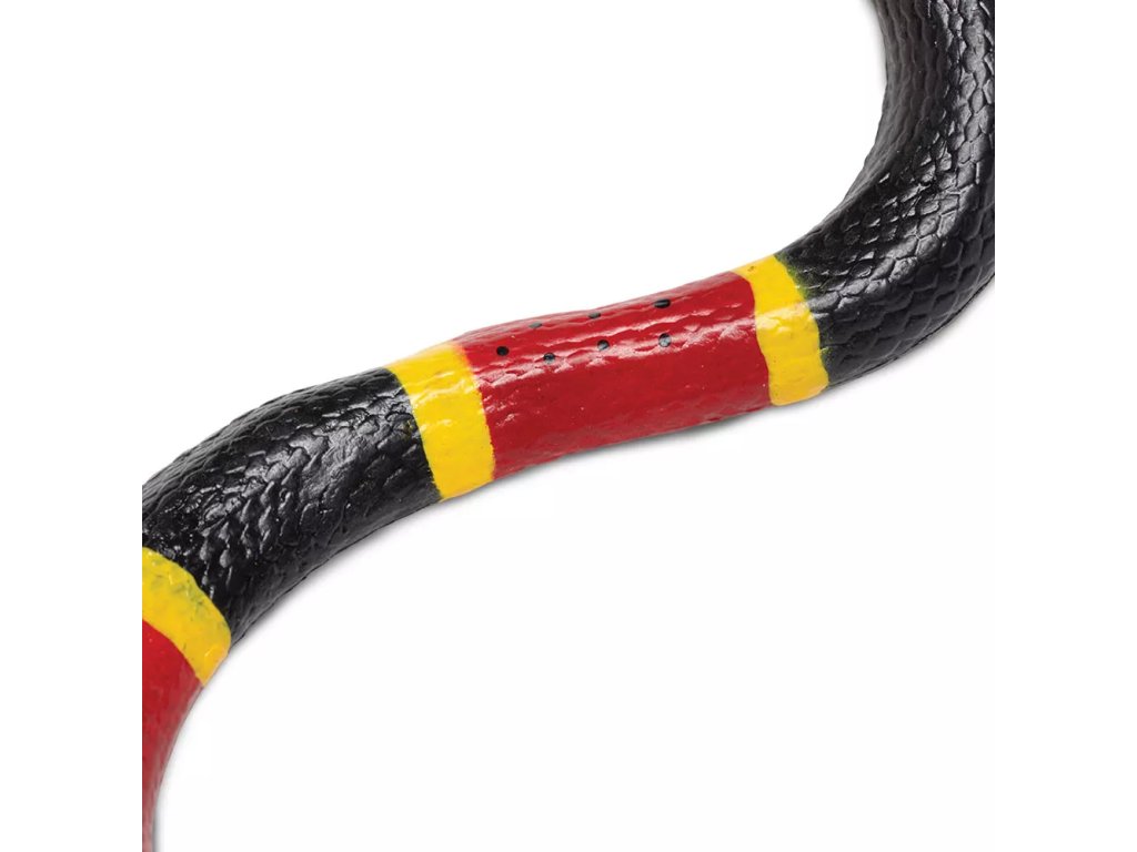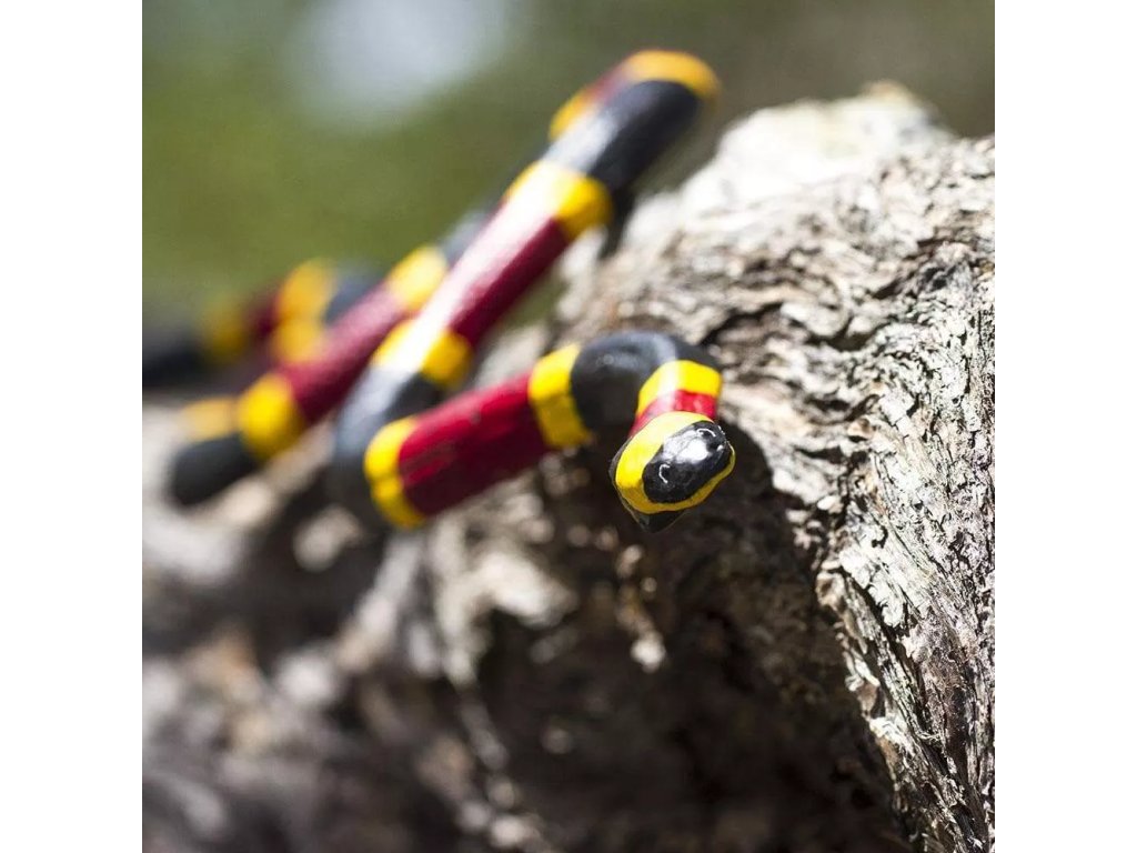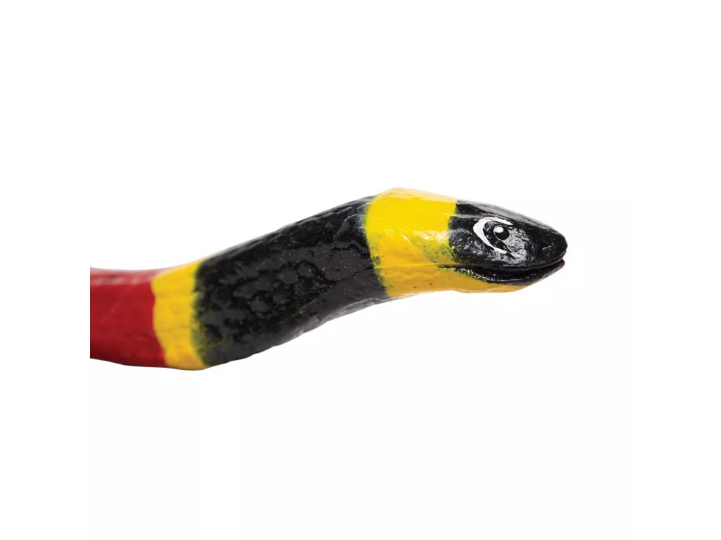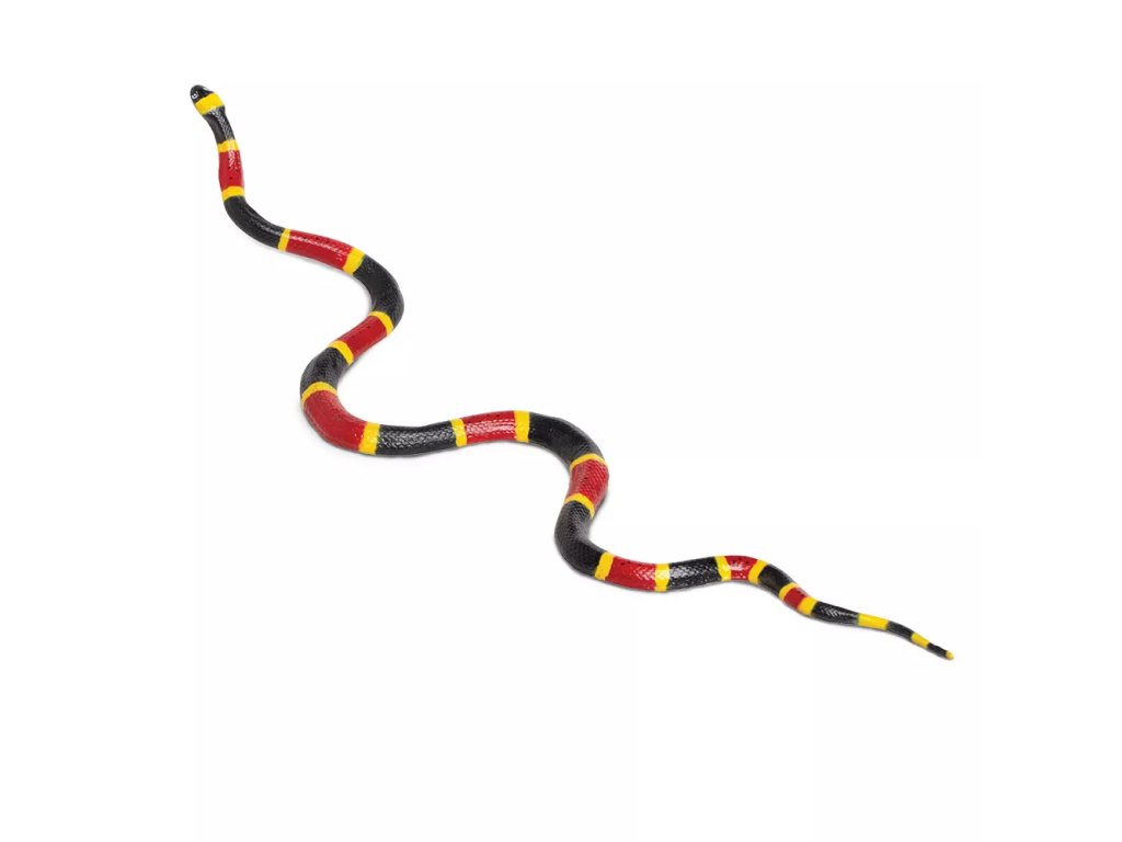 Figurka pestrobarevného jedovatého hada z kobří rodiny, který je typický svými nápadnými pruhy v červené, žluté, bílé a černé barvě.