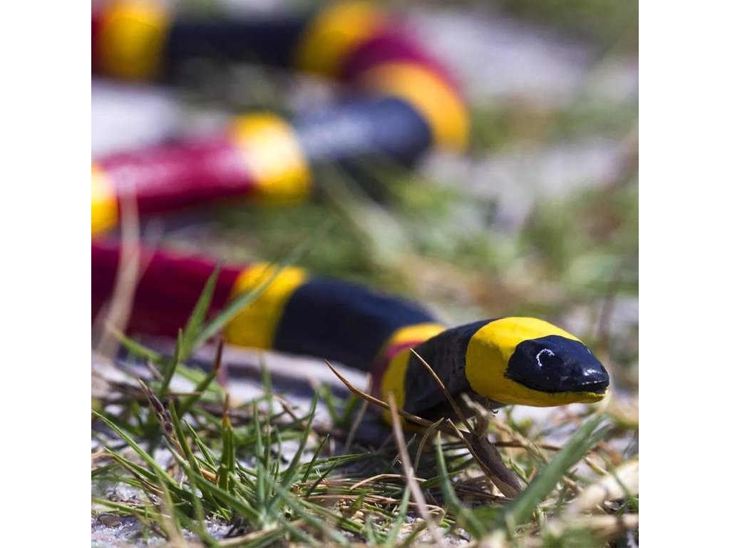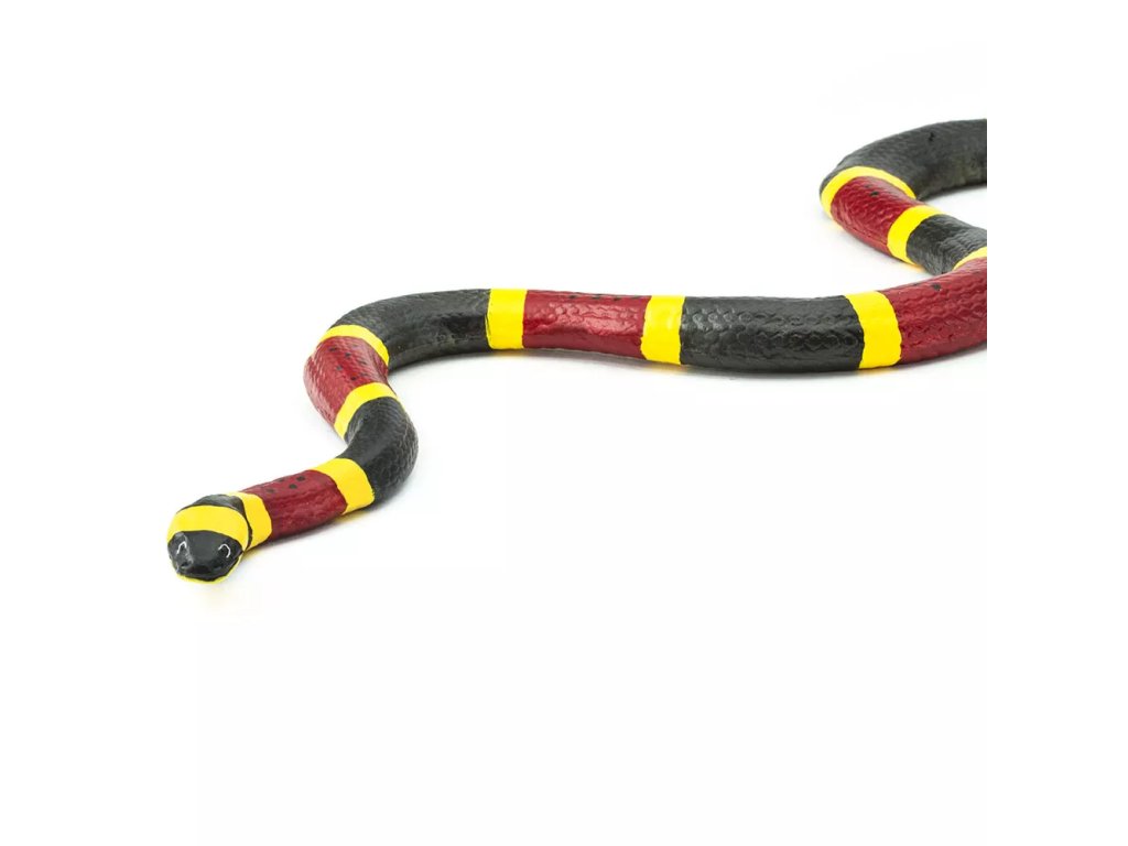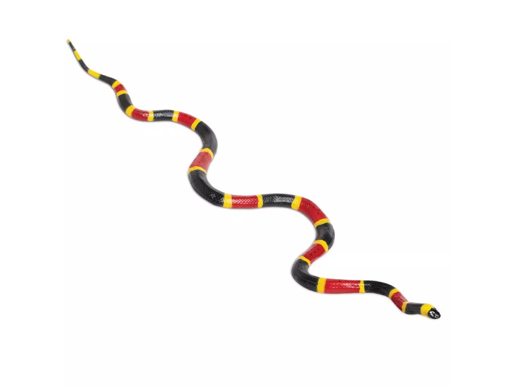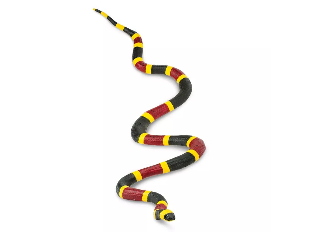Figurka pestrobarevného jedovatého hada z kobří rodiny, který je typický svými nápadnými pruhy v červené, žluté, bílé a černé barvě.