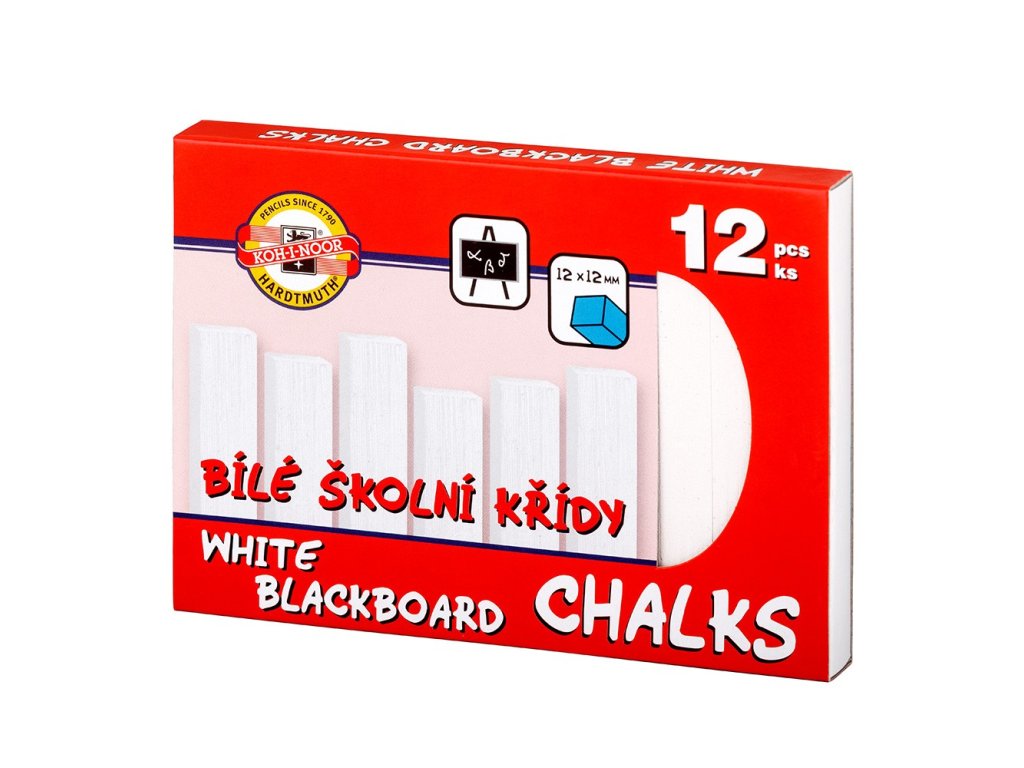 Sada 12 kusů školních bílých čtyřhranných kříd o rozměrech 12x12x100 mm, které jsou určeny pro psaní na školní tabule, vložených do krabičky s potištěnou manžetou a eurozávěsem. Upozornění. Nevhodné pro děti do 3 let. Možnost odlomení malých částí. Nebezpečí zalknutí.
