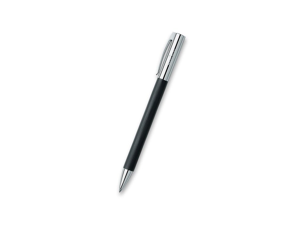 Kuličkové pero Faber-Castell Ambition Precious Resin s tělem z broušené černé pryskyřice v kombinaci s doplňky z pochromovaného leštěného kovu.