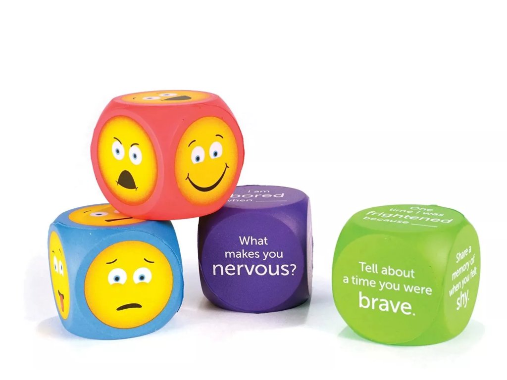 nechte děti házet kostkami s emotikonami a diskutujte společně o pocitech a emocích, které namalované tváře znázorňují