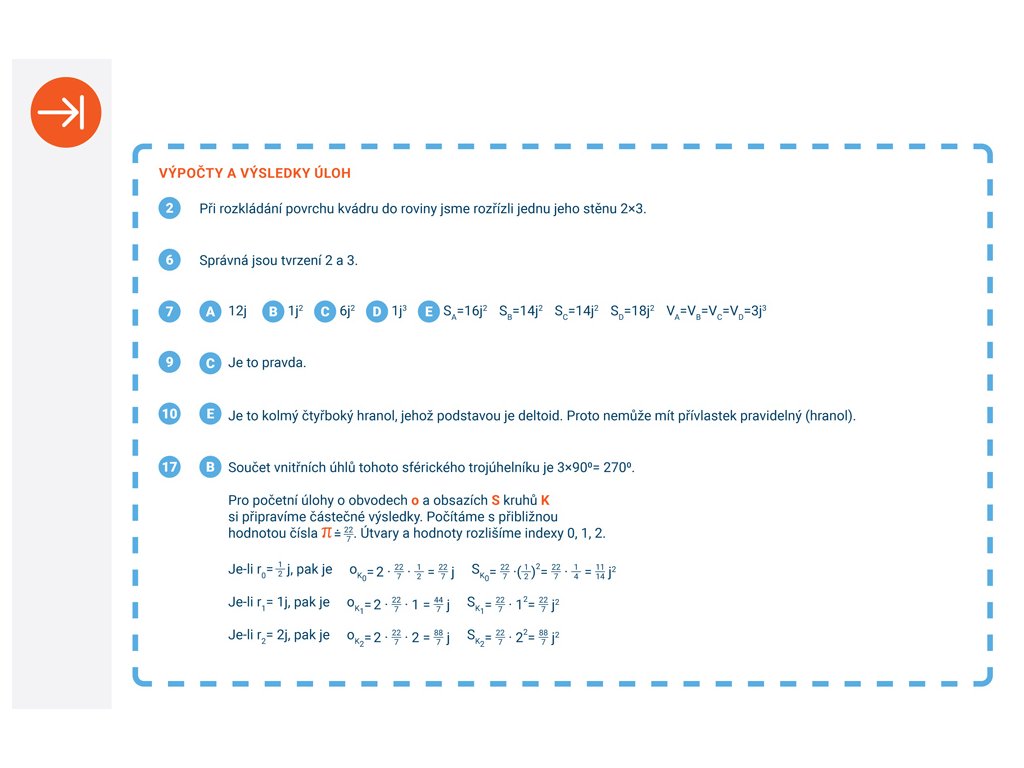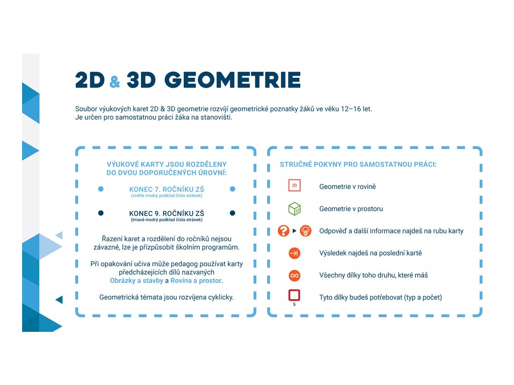 Řazení karet a rozdělení do ročníků nejsou závazné a lze je přizpůsobit školním programům. Při opakování učiva může pedagog používat karty z předcházejících dílů nazvaných Obrázky a stavby (box Geometrie-1) a Rovina a prostor (box Geometrie-2). Geometrická témata jsou rozvíjena cyklicky.