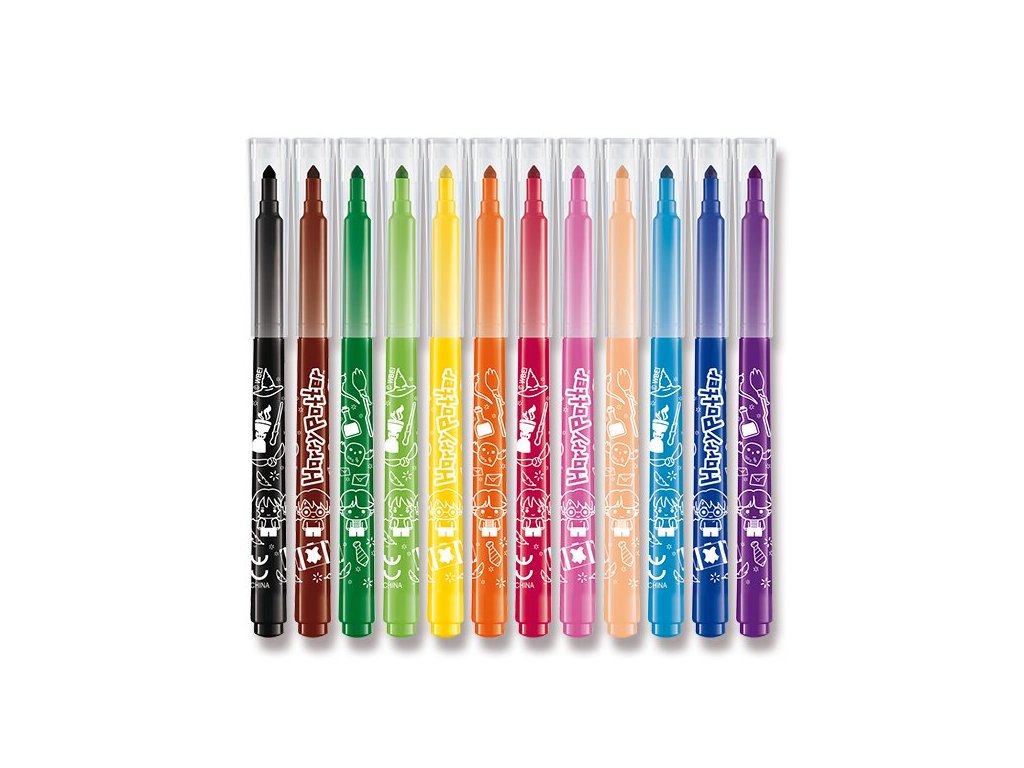 Souprava 12 kusů barevných fixů se snadno vypratelným a omyvatelným inkoustem s atraktivními motivy Harryho Potter mají zářivé barvy, hrot odolný proti zatlačení či poškození a účinný uzávěr. Dlouhá životnost. Trojúhelníkový úchop pro lepší a pohodlnější držení. Praktické pouzdro s uzavíráním na zip.