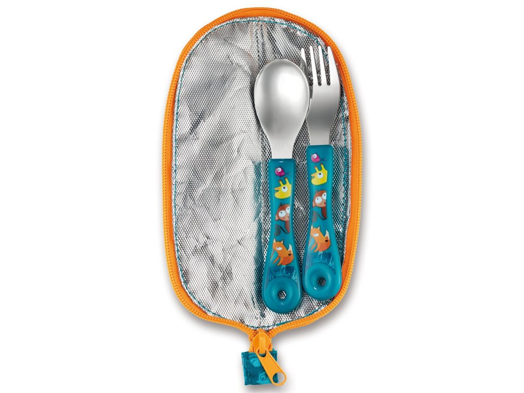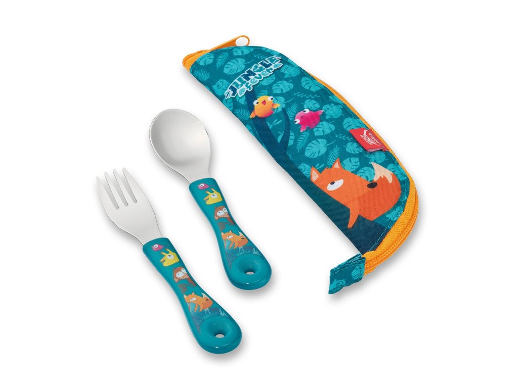 Příbor z nerezové oceli v pouzdře z kolekce Miniz v designu Jungle Fever. Pouzdro obsahuje lžičku a vidličku. Textilní pouzdro je na zip a jako vnitřní materiál má hliníkovou fólii pro snadné čistění. Příbory je možné mýt v myčce. Vhodné pro děti od 1 roku.