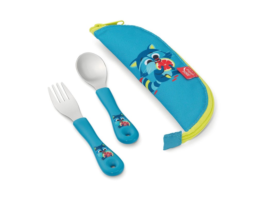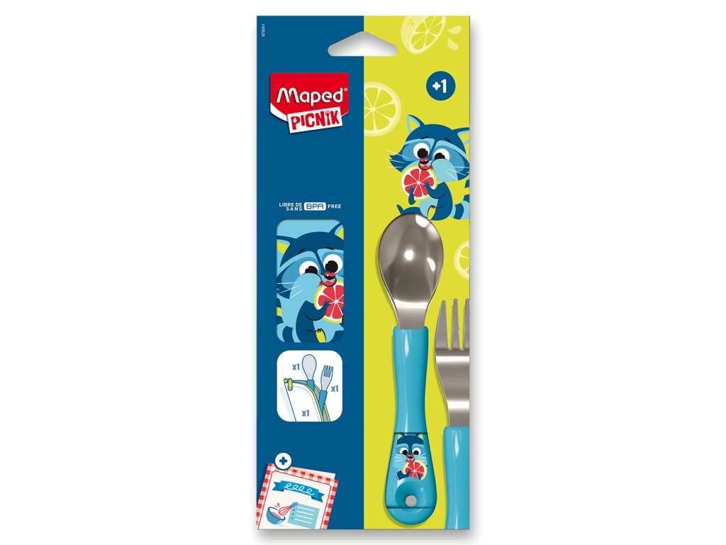 Příbor Maped Picnik z nerezové oceli v pouzdře z kolekce Miniz v designu Raccoon. Pouzdro obsahuje lžičku a vidličku. Textilní pouzdro je na zip a jako vnitřní materiál má hliníkovou fólii pro snadné čistění. Příbory je možné mýt v myčce. Vhodné pro děti od 1 roku.