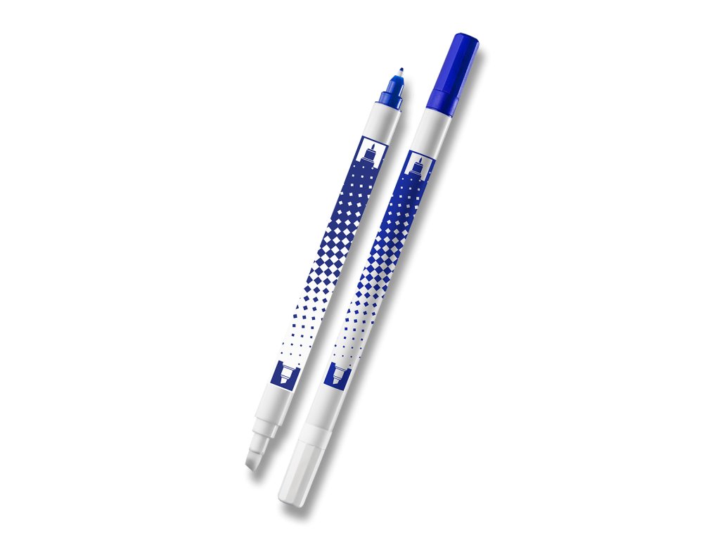 Zmizík s přepisovačem. Seřiznutá špička, která umožňuje širokou i tenkou stopu zmizíkování, Určeno pro modrý zmizíkovatelný inkoust.