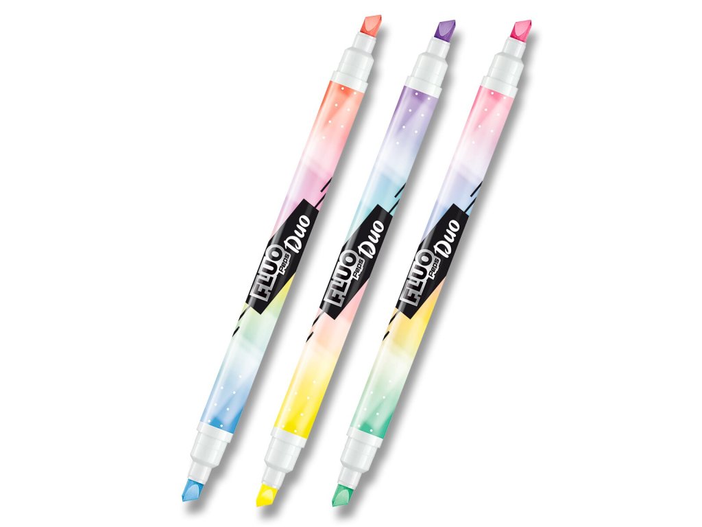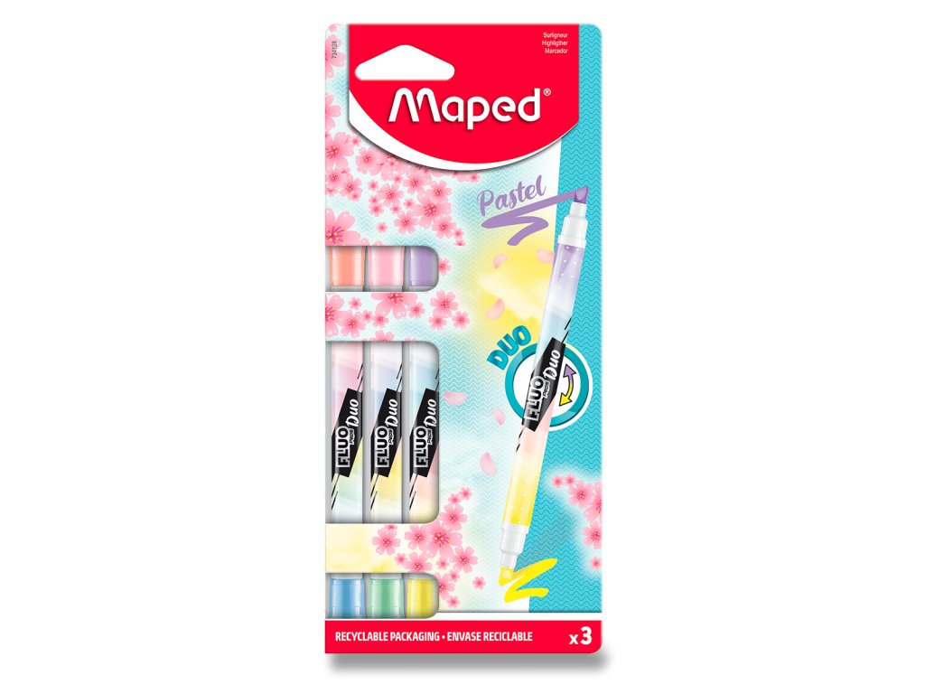 Oboustranný zvýrazňovač Maped Fluo Peps Duo Pastel v pastelových barvách. Na každém konci zvýrazňovače je jiná barva. Inkoust na vodní bázi a je vysoce odolný proti vysychání i proti vyblednutí. Mix 3 zvýrazňovačů s 6 barvami.