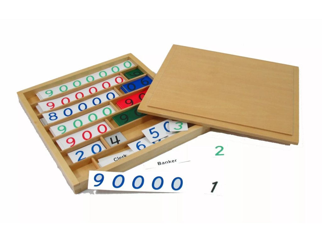 Bankovní hra je navržena pro práci v kolektivu dětí, kde každé může zastávat různou roli (bankéř, pokladník, kontrolor ad.). Během hry si děti nenásilně procvičují velké násobení. Barevné karty s čísly jsou přehledně uloženy v přihrádkách dřevěné krabice s víčkem.