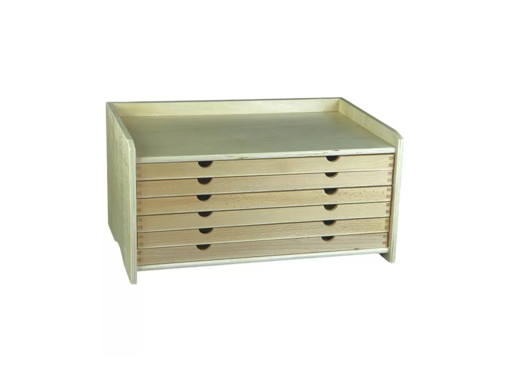 Dřevěná geometrická komoda se 6 zásuvkami, které obsahují 35 rovinných tvarů: „tvar“ a jemu odpovídající „rámeček“.