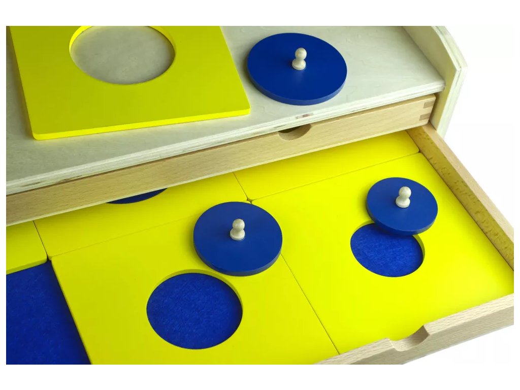 Necháme dítě vybrat podnos, se kterým chce pracovat a donést ho na kobereček. Podnos položí do jeho horního levého rohu. Dítě vyjme první tvar z leva nedominantní rukou a obkrouží tvar dvěma prsty dominantní ruky. Pak tvar položí na kobereček. Stejným způsobem pracuje se všemi zbylými tvary. Tvary jsou na koberečku neuspořádaně. Následně dítě porovnává tvary přikládáním na sebe a řadí je zleva doprava tak, jak to cítí. Vytvoří si vlastní řád tak, jak potřebuje. Po dokončení řady, začne tvary vracet zpět do rámů na podnose. Jakým způsobem, ponecháme na dítěti. Necháme je experimentovat. Pak podnos uloží zpět do geometrické komody. Pokud se dítě ptá, tvary pojmenujeme. Nikoli ale při úplně první ukázce, aby si dítě prožilo odlišnosti tvarů všemi smysly nerušeně.