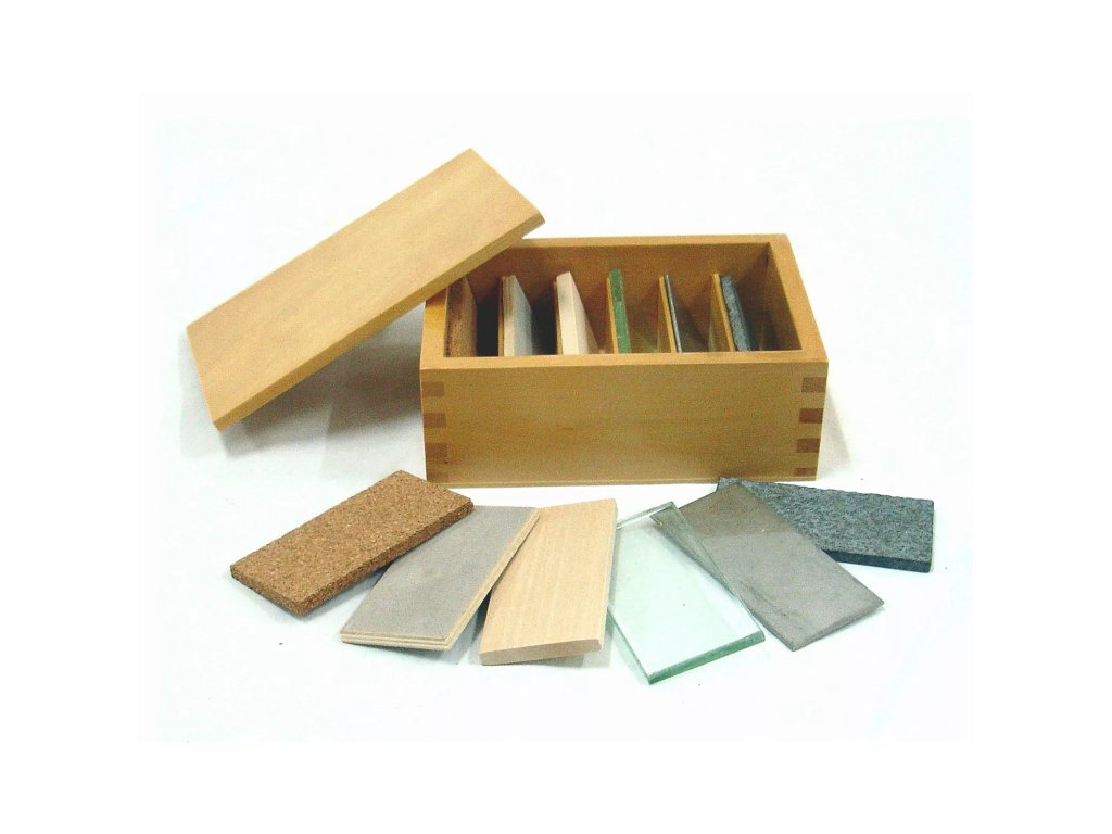 Krabička obsahuje šest párů destiček, které se liší svými tepelně vodivými vlastnostmi jako: dřevo, plsť, korek, sklo, mramor a železo.