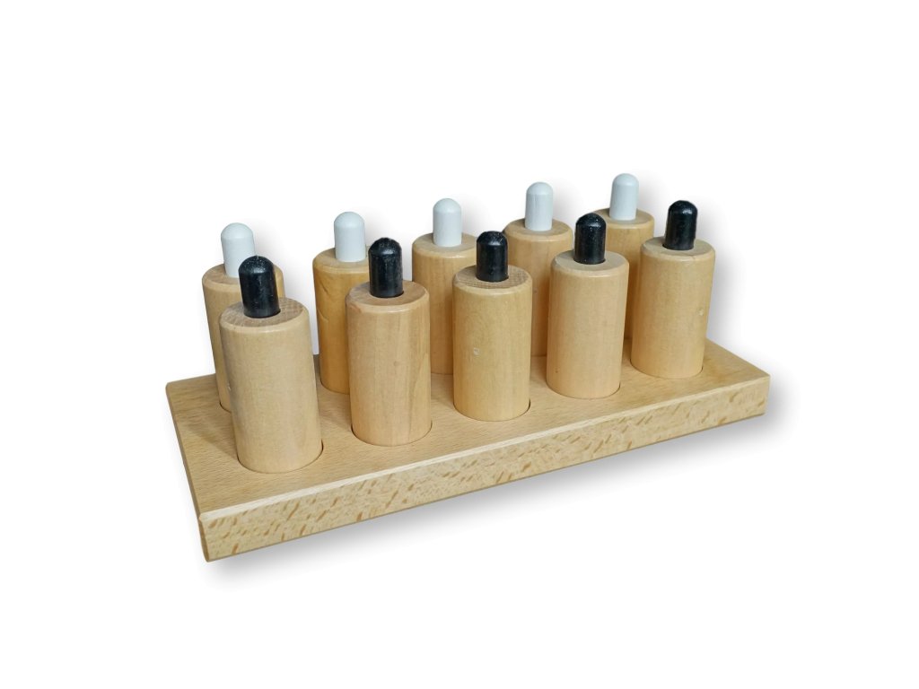 Dřevěný tácek obsahuje 6 párů válců s různým odporem při stlačení pístu s černými a bílými vrchy pro spárování. Přínos pomůcky -vnímání odporu / tlaku („těžko“ X „lehko“) -jemná motorika, spolupráce ruka – oko -rozšíření slovní zásoby: válec, píst, tlak, odpor Práce s pomůckou Přeneste podnos s válečky na kobereček nebo stolek a umístěte jej do levého horního rohu. Vezměte váleček s bílým pístem do levé ruky, stlačte píst ukazováčkem (menším dětem se možná bude lépe stlačovat palcem). Poté berte do pravé ruky válečky s černým pístem a hledejte váleček se stejným tlakem. Vybrané páry pokládejte vedle sebe do dvojic.
