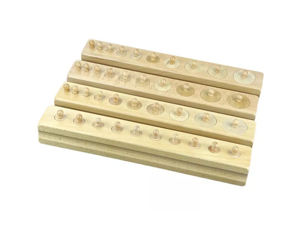 Válečky s úchyty patří do skupiny smyslových Montessori pomůcek. Rozvíjeným smyslem je v tomto případě zrak, ale jako u každé smyslové pomůcky dítě používá a rozvíjí všechny smysly.