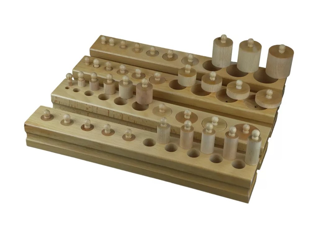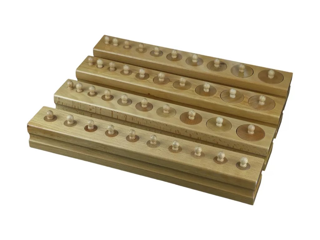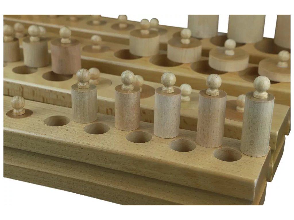 Válečky s úchyty patří do skupiny smyslových Montessori pomůcek. Rozvíjeným smyslem je v tomto případě zrak, ale jako u každé smyslové pomůcky dítě používá a rozvíjí všechny smysly.