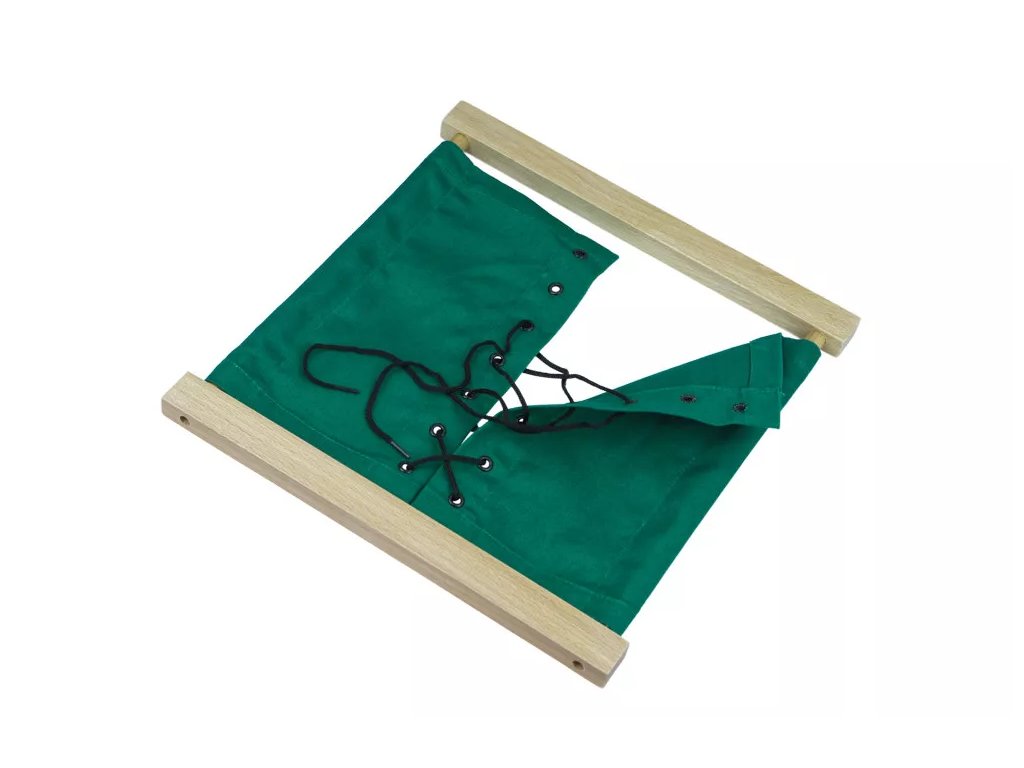 Zapínací rám s tkaničkou je součástí Montessori pomůcek praktického života - péče o sebe sama.