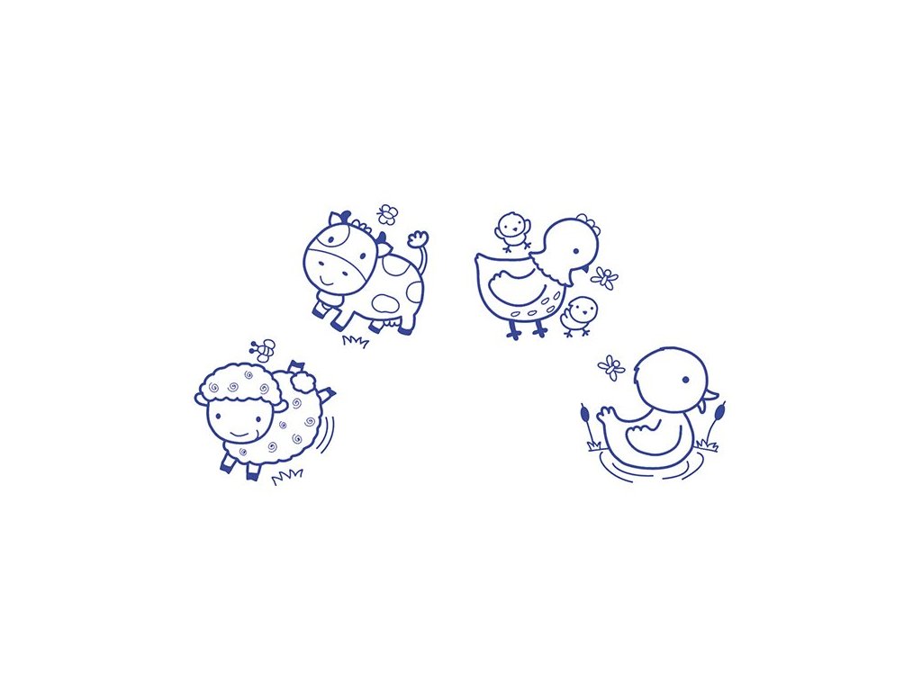 Sada obsahuje 4 ergonomicky tvarovaná razítka s motivem zvířátek ze dvorka a fialovou razítkovací podušku s vypratelným inkoustem. Razítka mají snadný úchop pro batolata, hlubokou texturu a velký obtisk o průměru 5 cm. Razítka jsou určená pro děti už od 18 měsíců.