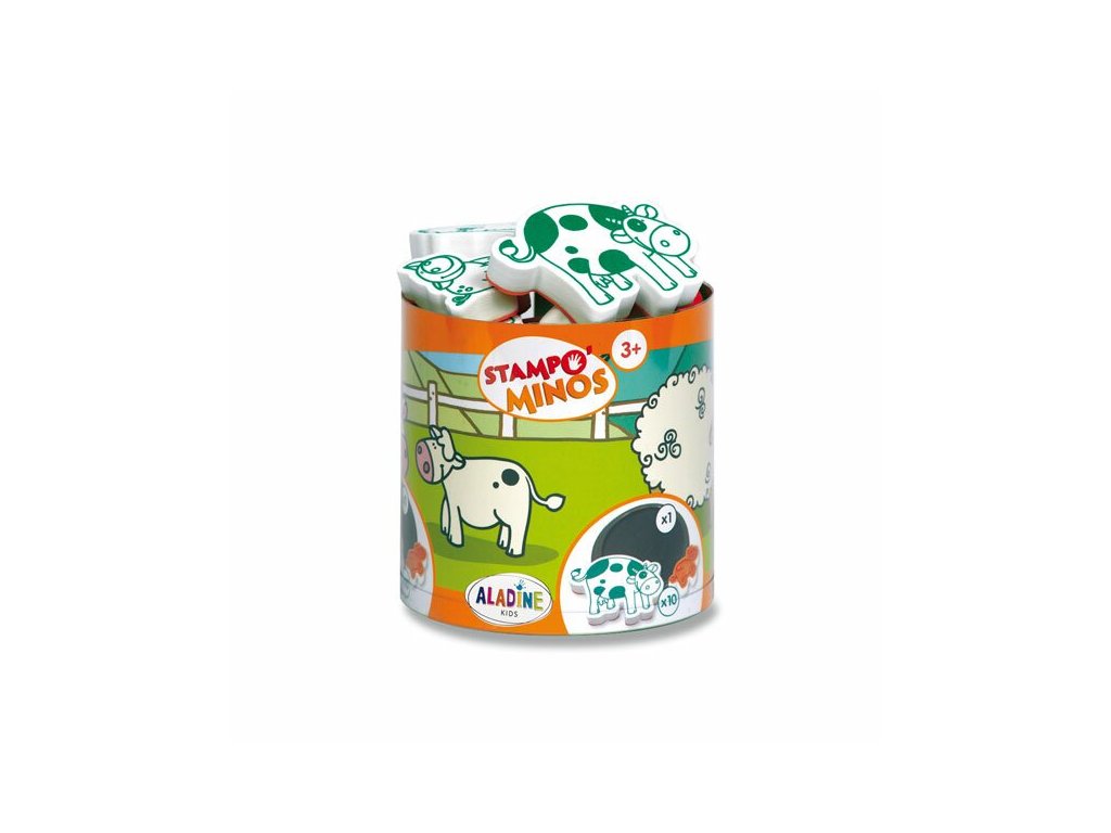Sada obsahuje 10 ks různých tamponových razítek Aladine Stampo Minos - Domácí zvířátka, které dělají opravdu velké obtisky, a 1 podušku s černou razítkovací barvou.