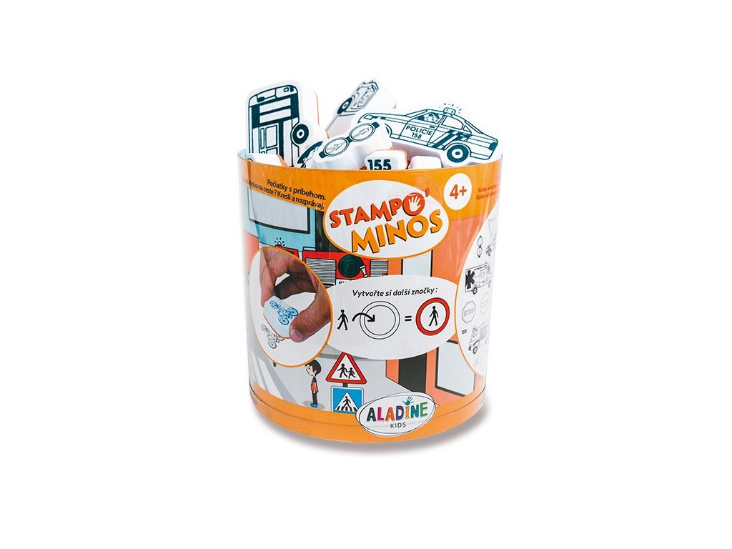 Sada Razítka Aladine Stampo Minos - Dopravní prostředky obsahuje 28 ks různých tamponových razítek Stampo Minos a 1 podušku s černou razítkovací barvou.