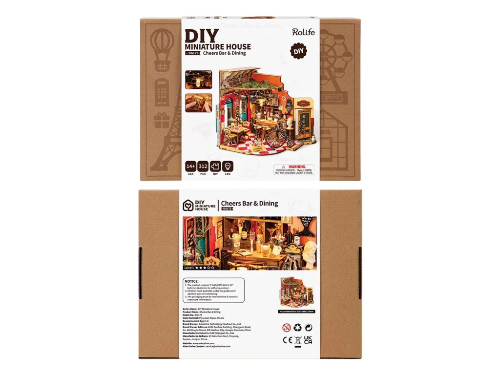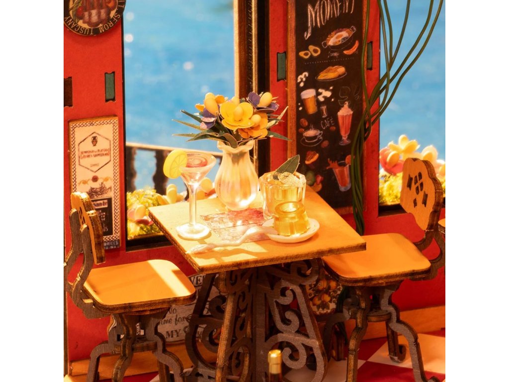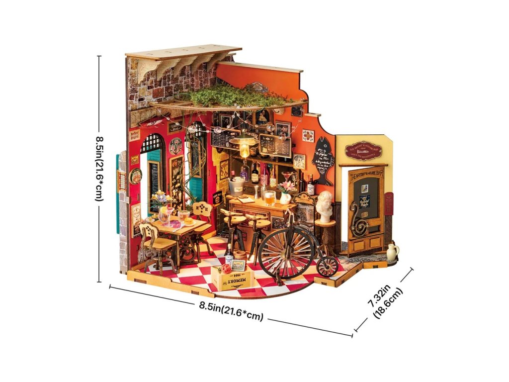 Uvolněte se a užijte si atmosféru stylového baru a bistra, které Vás okouzlí svou nostalgickou atmosférou. Uvnitř Vás čeká pohodlné posezení, oblouková okna, elegantní barový pult a řada lahví vína, a to vše vytvářejí intimní a přívětivou atmosféru. Tabule s denní nabídkou jsou rozestavené po celém interiéru a lákají na speciality kuchyně. Každá stěna je ozdobena retro plakáty a nechybí ani klasické dekorace jako vysoký starodávný velociped, socha na podstavci nebo dřevěné cedulky, které dohromady vytvářejí důvěrně známý útulný evropský styl. Kombinace LED lampičky a drobných stropních světýlek navozuje domáckou atmosféru pohody. 3D skládačka je skvělý způsob, jak si užít kreativní a edukativní hraní a zároveň vytvořit nádherný model, který se může stát netradičním dárkem či ozdobou interiéru. Skládání podporuje rozvoj jemné motoriky, prostorového myšlení a trpělivosti. Je to možnost, jak kombinovat zábavu se vzděláváním. Všechny přesně vyřezané dílky do sebe lehce zapadnou bez použití lepidla či nástrojů, aby výsledek byl stabilní a odolný. Skládačka je dodávána v nesloženém stavu, zabalená v krabici s podrobným návodem k sestavení. K napájení slouží 2 AAA baterie (nejsou součástí balení). Hlavní vlastnosti: 312 dílkůdoba skládání 5 hodinměřítko 1 : 18střední obtížnost sestaveníLED osvětlenísestavení bez použití lepidla a nástrojůvýjimečný vzhledvhodné pro děti i dospělérozvíjí logické a motorické dovednostipodporuje trpělivost dětíideální dárek nebo jedinečná dekoracenapájení pomocí 2x AAA /LR03/AM4 1,5 V (nejsou součástí balení)