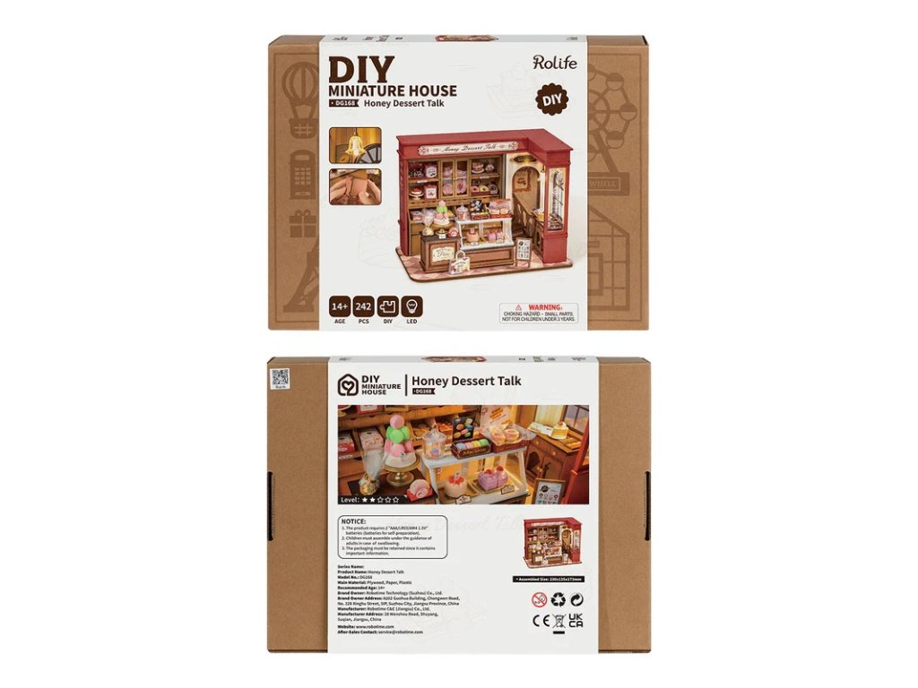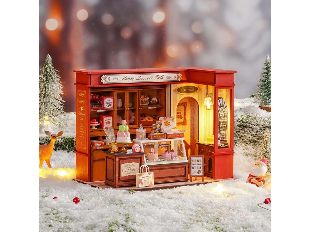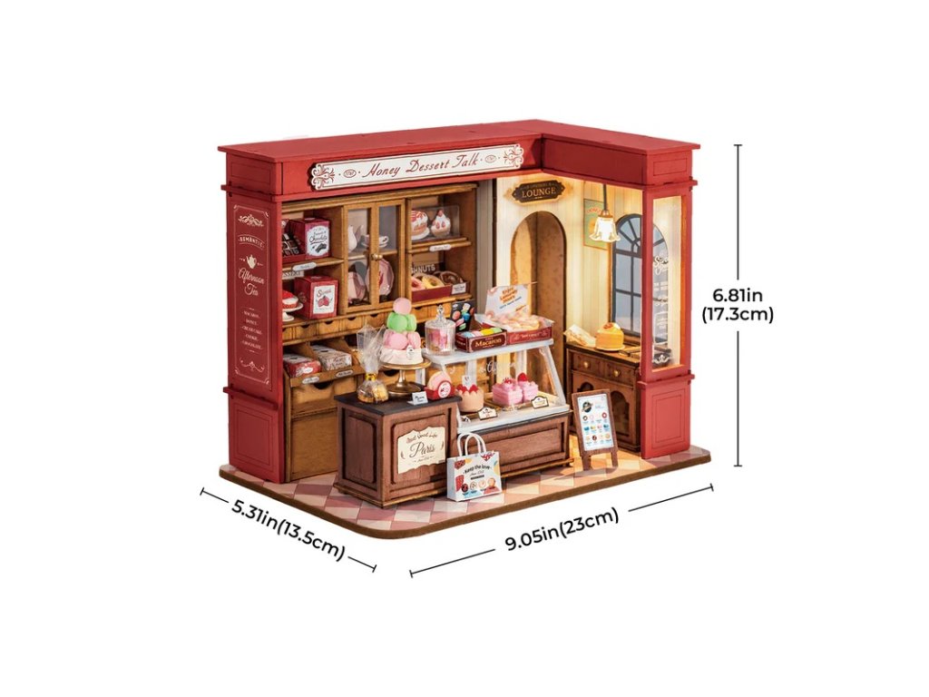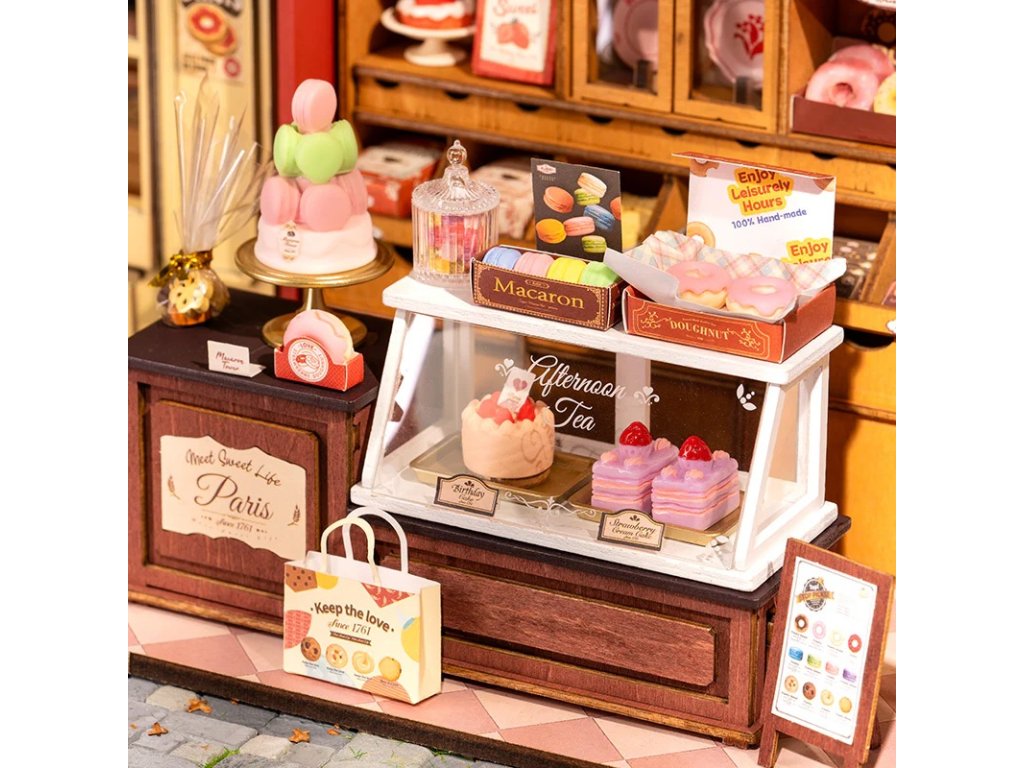 Je čas na něco sladkého! Vyberte si z vynikajících dezertů z nabídky útulné francouzské cukrárny, které jsou vystavené v dřevěných policích nebo skleněné vitríně. Nabídka je široká. Máte chuť na makronky, máslové sušenky, dortíky, čokoládu nebo donuty? Nebo si raději dáte čaj či kávu? V dóze jsou připraveny dokonce gumové bonbóny pro malé mlsouny! Dvířka skříněk jsou otevírací, takže si můžete zboží vystavit podle svého přání. Vychutnejte si atmosféru klidu a pohody, která je umocněna příjemným LED osvětlením. 3D skládačka je skvělý způsob, jak si užít kreativní a edukativní hraní a zároveň vytvořit nádherný model, který se může stát netradičním dárkem či ozdobou interiéru. Skládání 3D skládačky podporuje rozvoj jemné motoriky, prostorového myšlení a trpělivosti. Je to možnost, jak kombinovat zábavu se vzděláváním. Všechny přesně vyřezané dílky do sebe lehce zapadnou bez použití lepidla či nástrojů, aby výsledek byl stabilní a odolný. Skládačka je dodávána v nesloženém stavu, zabalená v krabici s podrobným návodem k sestavení. K napájení slouží 2x AAA /LR03/AM4 1,5 V (nejsou součástí balení). Hlavní vlastnosti: 242 dílkůdoba skládání 4 hodstřední obtížnost sestaveníLED osvětlenísestavení bez použití lepidla a nástrojůvýjimečný vzhledvhodné pro děti i dospělérozvíjí logické a motorické dovednostipodporuje trpělivost dětíideální jako dárek nebo jedinečná dekoracenapájení pomocí 2x AAA /LR03/AM4 1,5 V (nejsou součástí balení)