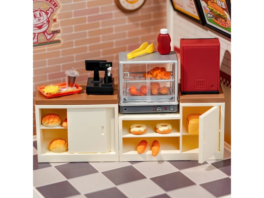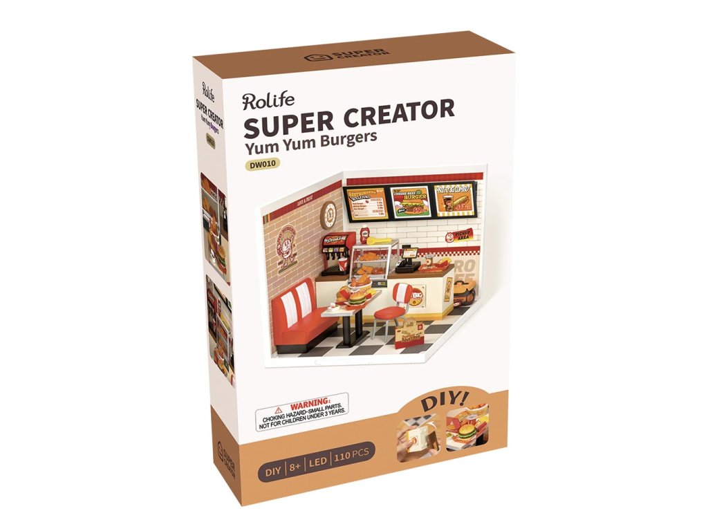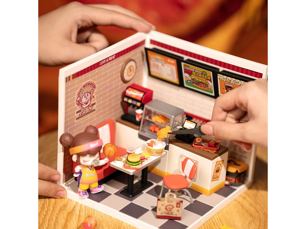 Máte rádi burgery? Užijte si nostalgickou atmosféru klasického rychlého občerstvení s nabídkou hamburgerů, hranolek, kuřecího masa, koblih a dalších dobrot. Poskládejte si restauraci s obslužným pultem a posezením vybavenou do nejmenších detailů včetně vitríny, nápojového automatu, smažených kuřecích kousků, kelímku a spoustu dalších doplňků. Spojením různých miniatur řady Super Creator Series vertikálně nebo horizontálně můžete vytvořit různorodý komplex domečků.Skládání skládačky podporuje rozvoj jemné motoriky, prostorového myšlení a trpělivosti. Je to možnost, jak kombinovat zábavu se vzděláváním. Všechny přesné dílky do sebe lehce zapadnou, aby výsledek byl stabilní a odolný bez použití lepidla. Skládačka je dodávána v nesloženém stavu, zabalená v krabici s podrobným návodem k sestavení. Hlavní vlastnosti: 110 dílkůdoba skládání 2 až 3 hodLED osvětleník napájení slouží kabel USB-C (je součástí balení)sestavení bez použití lepidlavýjimečný vzhledvhodné pro děti i dospělérozvíjí logické a motorické dovednostipodporuje trpělivost dětíideální jako dárek nebo jedinečná dekoracemožnost spojení více miniatur
